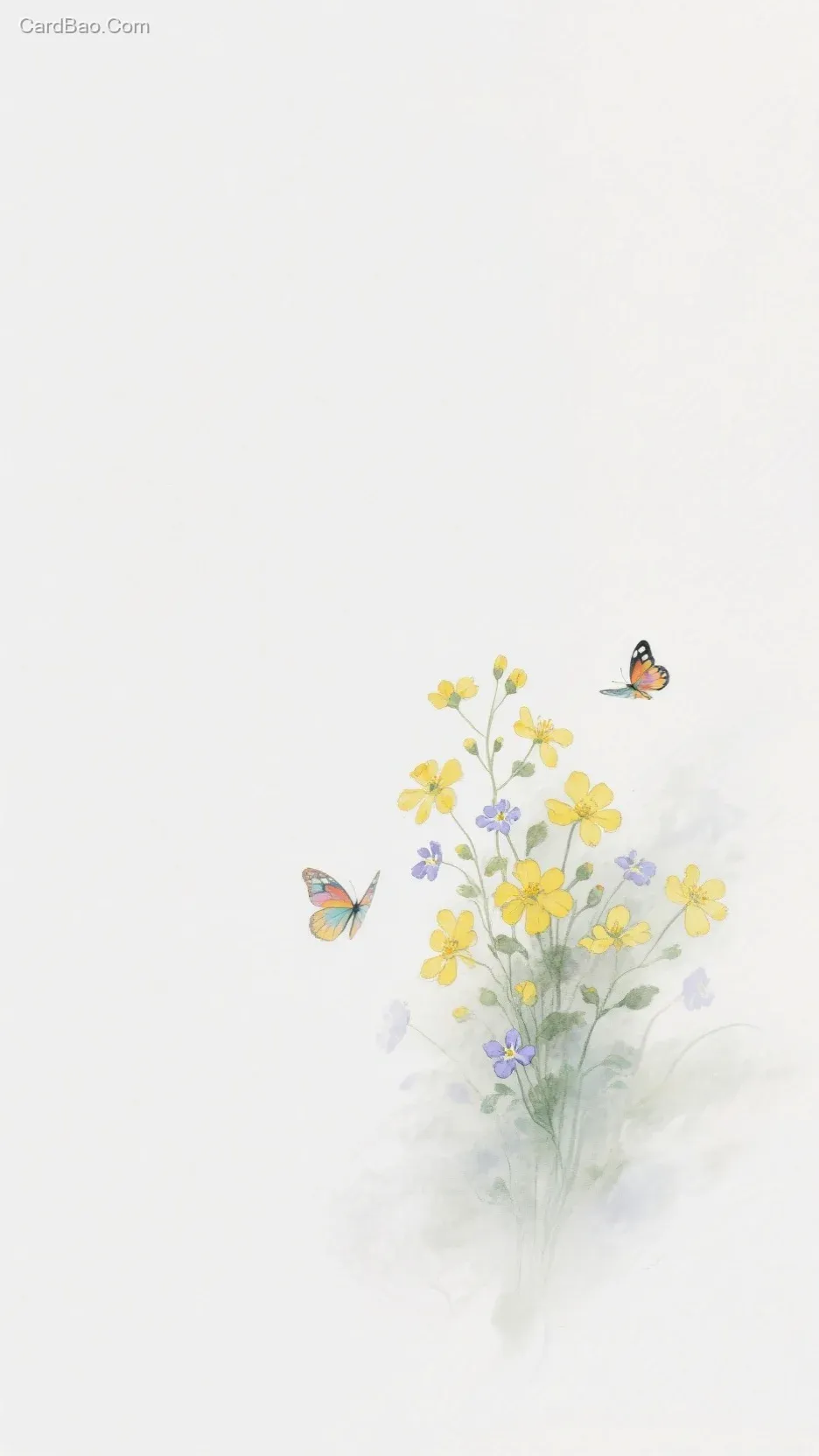 白色背景,画面右侧偏下,有一簇小黄花和小兰花的写意,水彩写意画法,黄花向对个方向伸展,姿态优美,极简写意手法,以水彩晕染出花朵和花簇的形态,花簇间有雾气的流动,大面积留白,画面极其优雅干净,有两只彩蝶飞舞,与花朵形成动静呼应
