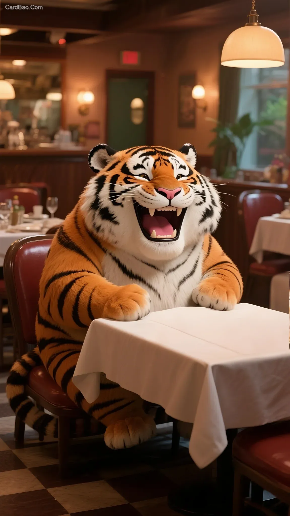 Personified realism, in a restaurant, a personified, stout tiger sits at the dining table with an expression of roaring laughter.