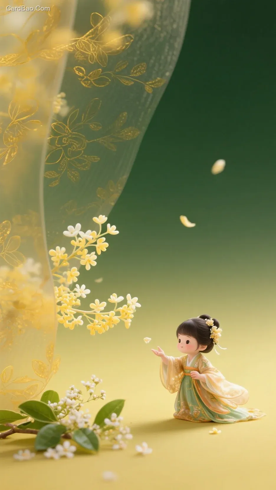 唯美小花壁纸,暗绿色黄色高清晰画质,高质量,超高清摄影,32K分辨率。金色和蜜蜡色渐变的小花纹理构成的整张背景图,通透黄白色小桂花,薄如绢纱,朦胧磨砂滤镜,肌理背景图,毛玻璃渐变背景,满天星还有绿色小叶子在左下角或右下角,占画面1/10,大面积留白。高清晰画质,高质量,超高清摄影,32K分辨率。通透的小花,半遮轻纱,朦胧磨砂滤镜,肌理背景图,毛玻璃有一个穿着绫罗绸缎的小萌姓在玩花辨