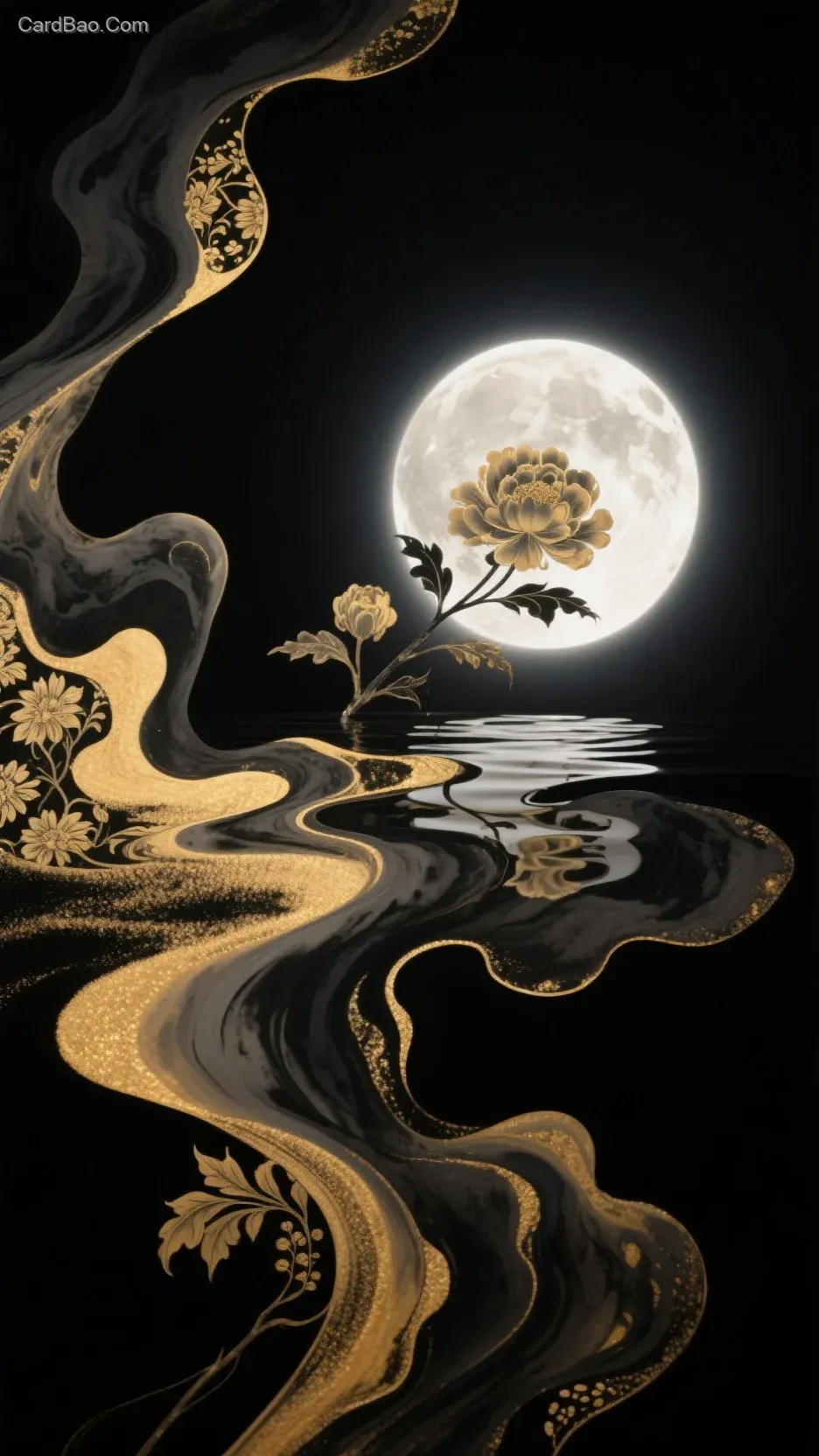 James Turrell, William Morris, fluid ink wash, a full moon, flowers, mirror and watermoon illusion of deep, fluid ink dance between, light and shadow interlacing painted on the ethereal, new Chinese classical aesthetics, the mood of distant ink flow rhyme, luxurious abstract black background alcohol ink technique, flowing sand, gold.