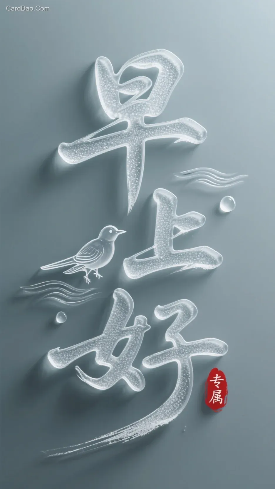 纯色透明哑光细颗粒质感做背景。上面的3D立体书法狂草手写毛笔字“早上好”,用玻璃雕刻腐蚀效果,内凹陷风格,深度压痕效果。有小鸟,水滴,水波纹作点缀,有红色印章“专属”,背景簡潔,自然生成。