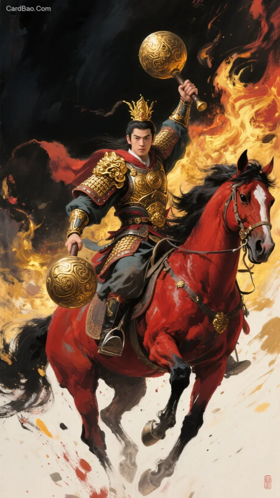 此为一幅精心绘制的泼彩水墨画作品,细节刻画入微,阴影处理细腻,具备伦勃朗风格,带有油画写实的质感和暗黑的色调,结合中西大写意的表现方式。画面的主角是中国古代年轻帅气的战将岳云,束金冠金甲加身,骑在一匹动态且姿态十分威武的大红马上,双手挥舞着两柄古代雕纹绣金大圆球金锤,一把在上,一把在下。大师级的构图使整个画面极具张力,背景是火焰 并夹杂着金色的光影。 图片风格为伦勃朗,画面有着清晰的笔触,伦勃朗光的运用使光照强烈,高细节、高清晰,涂抹感和肌理感明显,通过大笔触的处理结合色彩的冷暖对比,强透视与非传统的构图,3D