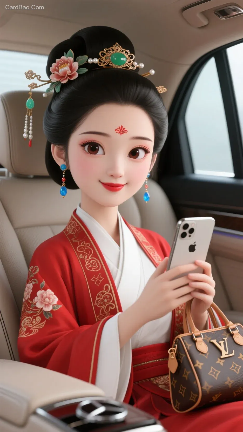 3D rendering, ultra-modernist style, featuring a beautiful and adorable ancient woman with precise facial features: large eyes, slender willow-leaf eyebrows with natural color, almond-shaped bright eyes exuding gentleness and liveliness, a small and delicate nose bridge, and full lips with a floral detail between the eyebrows. She wears vibrant red lipstick and has a faint smile at the corners of her mouth. Her jet-black, lustrous hair is styled in the Tang Dynasty's "startling swan" bun, adorned with a jade and pearl hairpin on one side and an intricately carved coral hairpin featuring peony motifs with exquisite, ornate pendants at the end. On the other side, she wears an elaborate and delicate floral headpiece, complemented by sapphire earrings. She is dressed in a traditional Tang-style red outfit with a white inner layer, seated in the back seat of a Maybach. In her right hand, she holds an Apple iPhone, while her left arm carries a stylish LV-brand handbag. The car's interior is modern, exquisitely decorated, and opulently detailed.