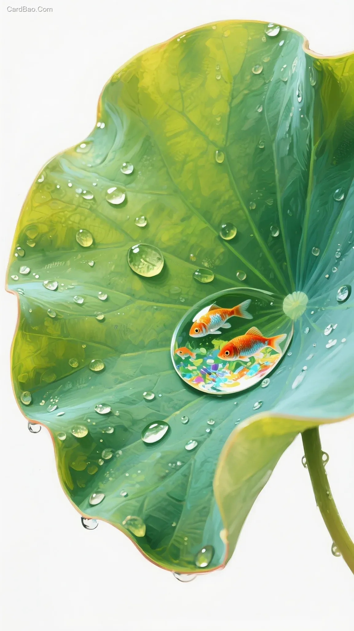 A large lotus leaf, set against a pure white background, ultra-detailed, vibrant colors, 8K resolution, oil painting style, luminous, bright hues, with water droplets on the petals, and tiny fish inside the water droplets.