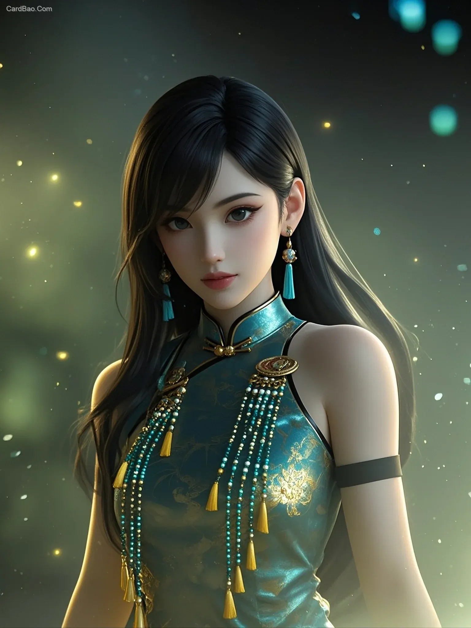 3D ancient style, Tifa, 3D photorealistic rendering, OC rendering, close-up shot, minimalist design, cheongsam design, enhanced depth of field, focus, high saturation, surreal illustration, intricate details of jewelry and clothing fringe textures, highly artistic, intensified grainy light and shadow, close-up shot, centered composition, yellow-blue-green color palette, elaborate details, masterpiece, fantasy color scheme, 8K.