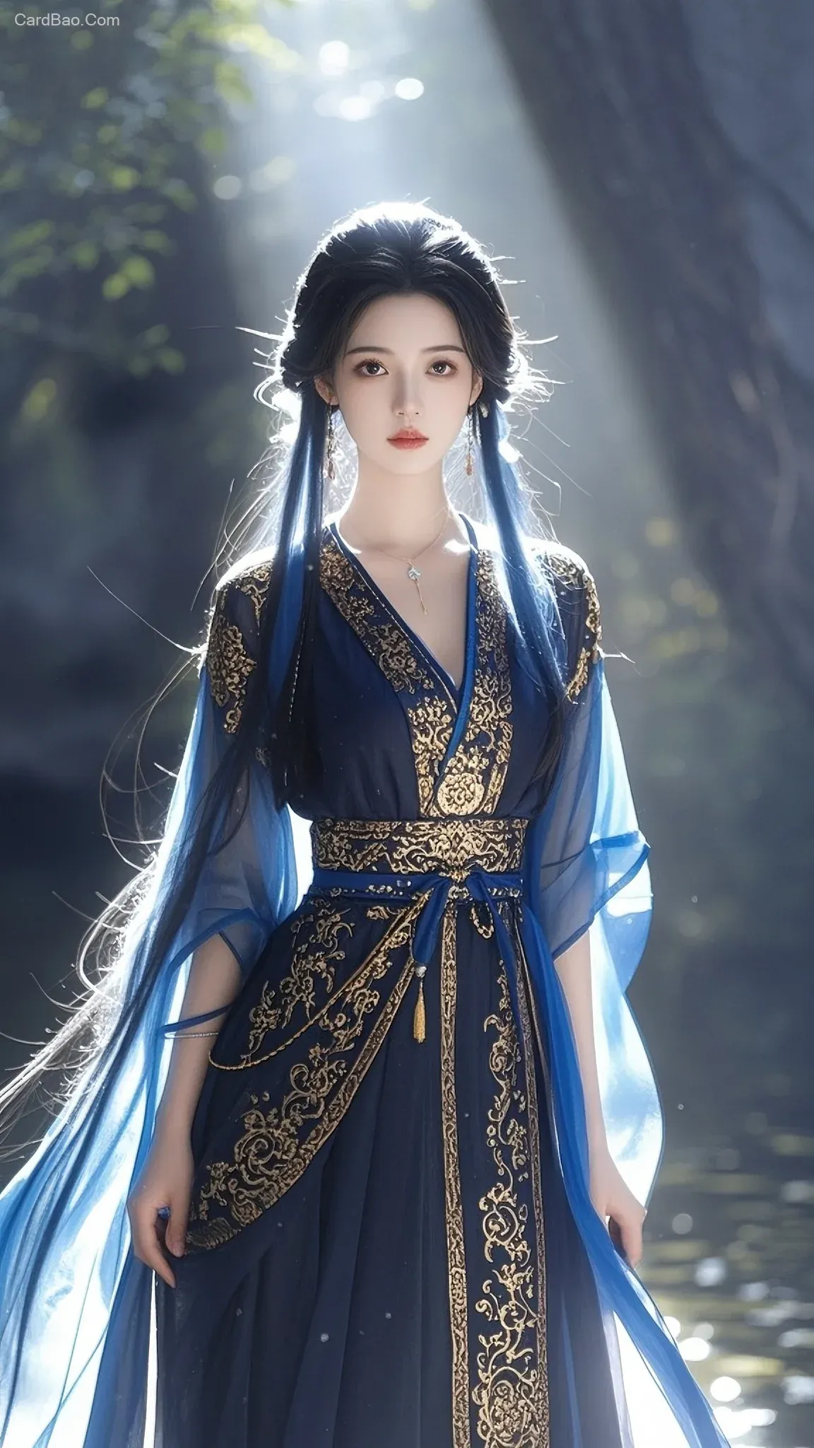 丁达尔效应,古风绝世女子、柳眉细长、乌黑长发、眸若星辰璀璨、深邃蓝色、肌肤羊脂白玉、长发如绸缎、深色金丝刺绣长裙、裙摆摇曳、素雅色调、优雅迷人。8K,景深。大师杰作,多重曝光