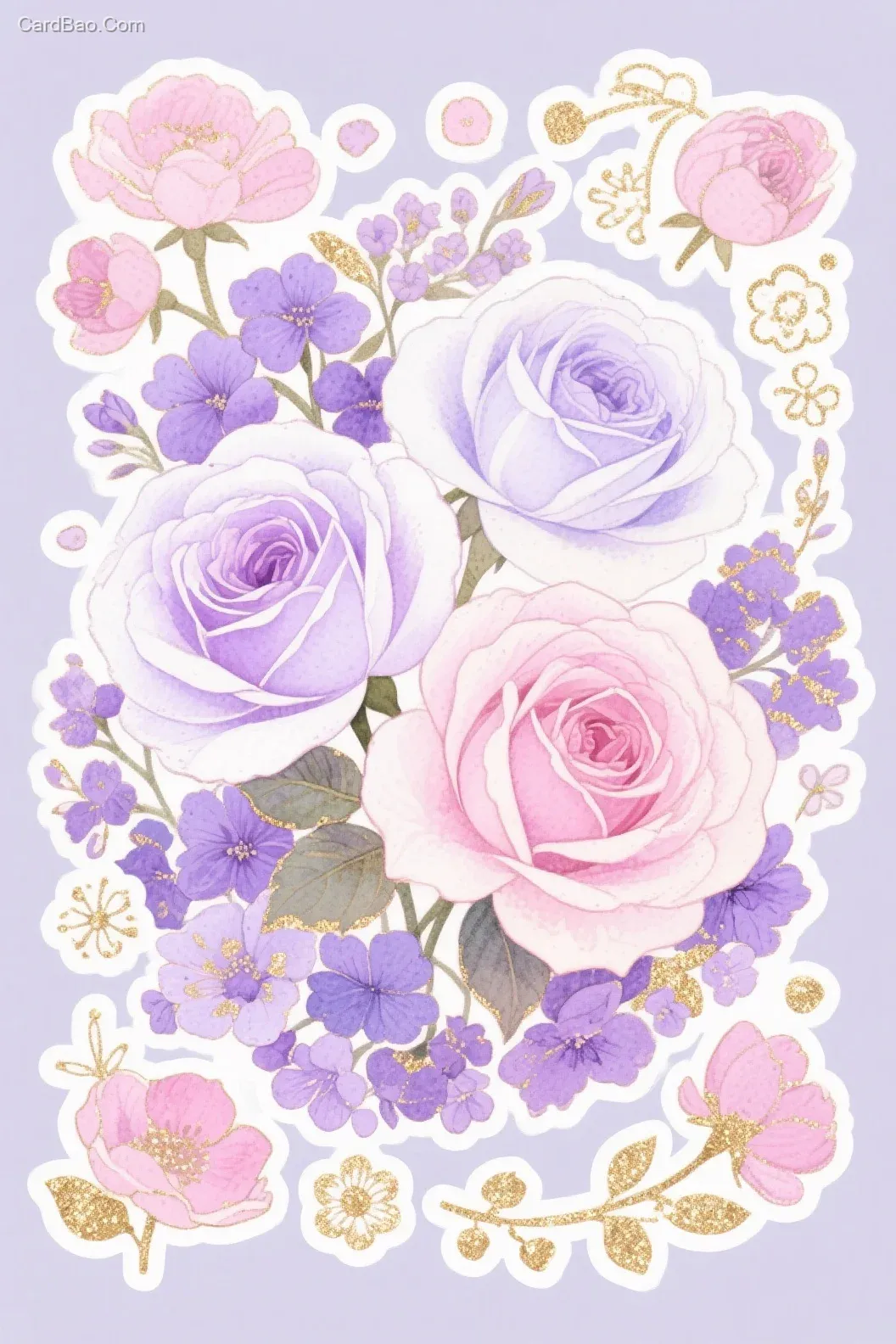 以三朵大朵的淡紫色与白色渐变、粉色玫瑰为核心主体,占据画面中心位置,形成视觉焦点 ,周围搭配小朵的粉色、紫色花卉及装饰性小花纹,拥挤簇拥在一起,营造主次分明的布局紫色花卉,色彩柔和浪漫,马卡龙色系,水彩风格,肌理感强,水彩线条强,笔触有水彩晕染的通透感、柔和边缘,色彩过渡自然,保留水彩特有的轻盈、灵动质感,金箔岩彩,主体细节丰富,工笔画风格,手账贴纸风格,一张5图