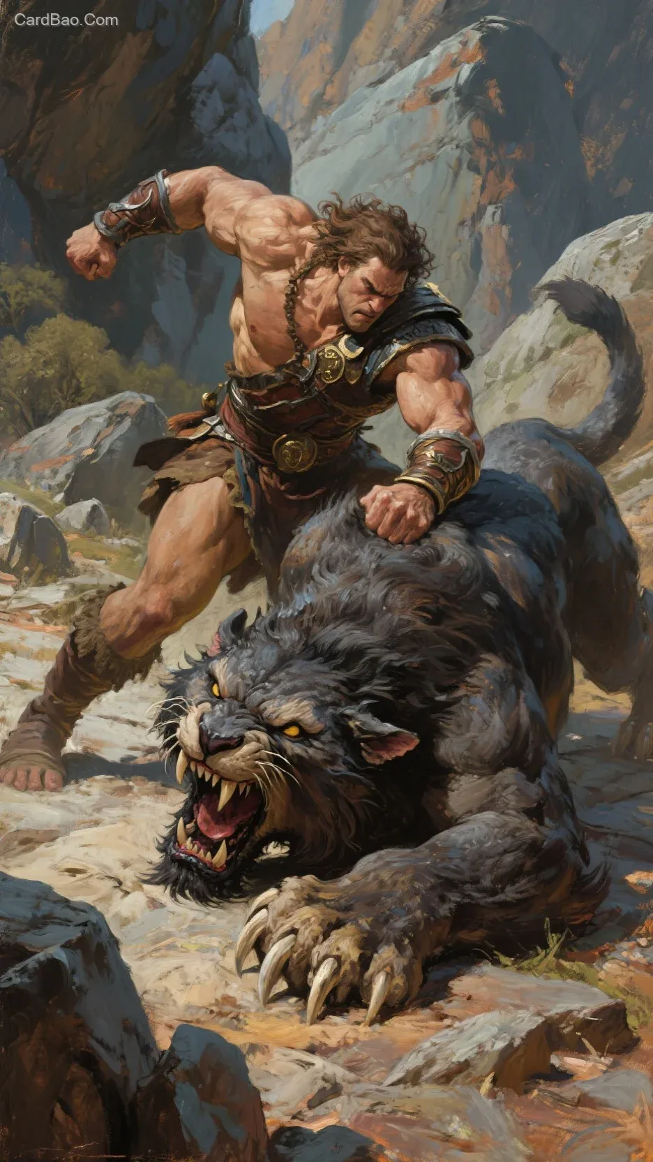 Oil painting impasto style, a robust warrior and a ferocious beast locked in combat, the warrior subduing the beast beneath his feet, tense atmosphere, hyper-realistic, American oil painting style, delicate brushstrokes, extreme detail, dramatic tension, background near rocks, masterpiece, close-up shot, high-definition 8K.