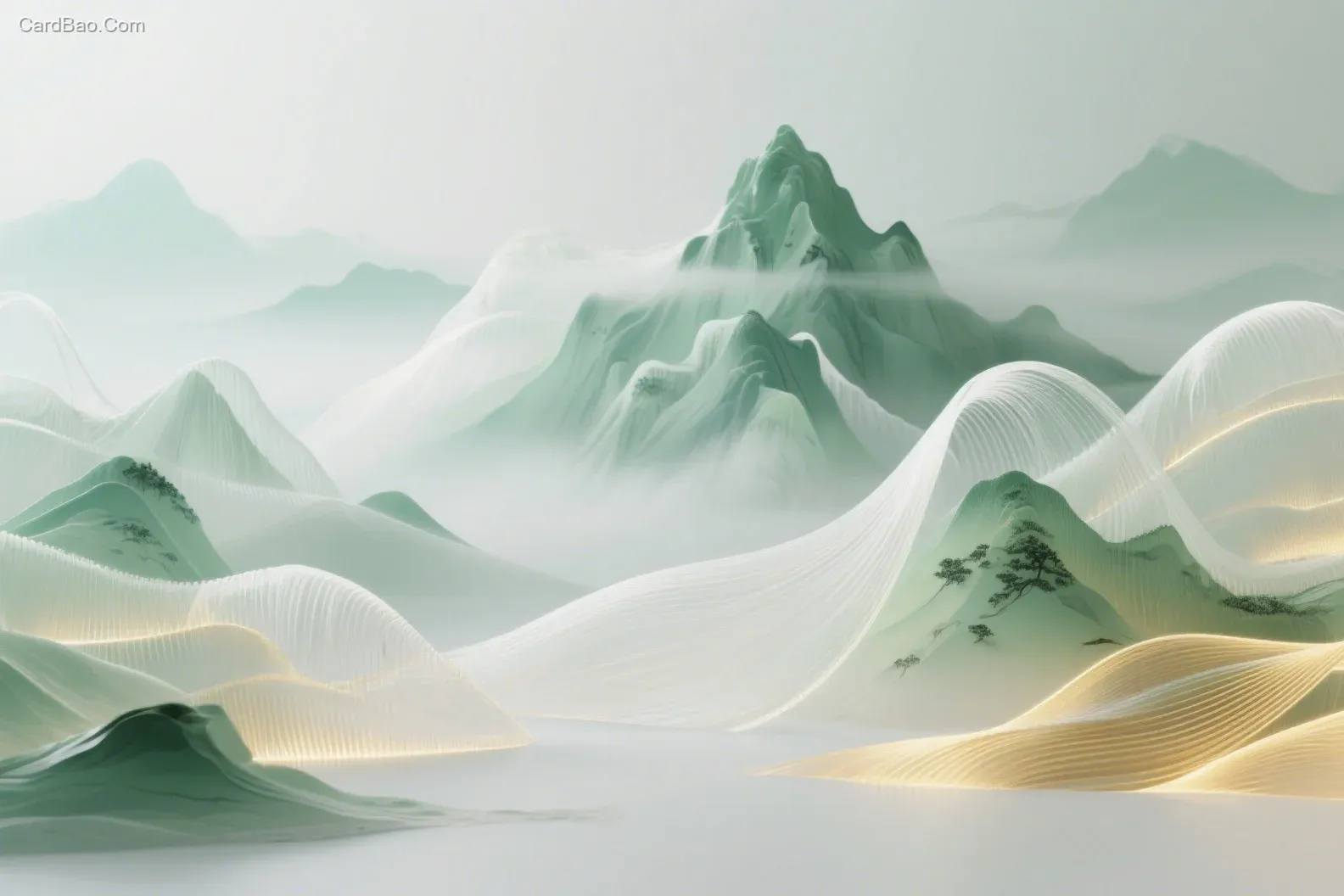 新中式,超现实主义风格,山水画,梦幻,高山仰止透明流动柔性纤维,淡淡绿白金色渐变色调,治愈配色,低饱和色,纤维发光艺术,3D设计,前卫艺术、先锋艺术、时尚摄影、概念设计、材质实验、干净背景,装置艺术,C4D渲染,大师风格,背景调色渐变,极简主义,大师作品。