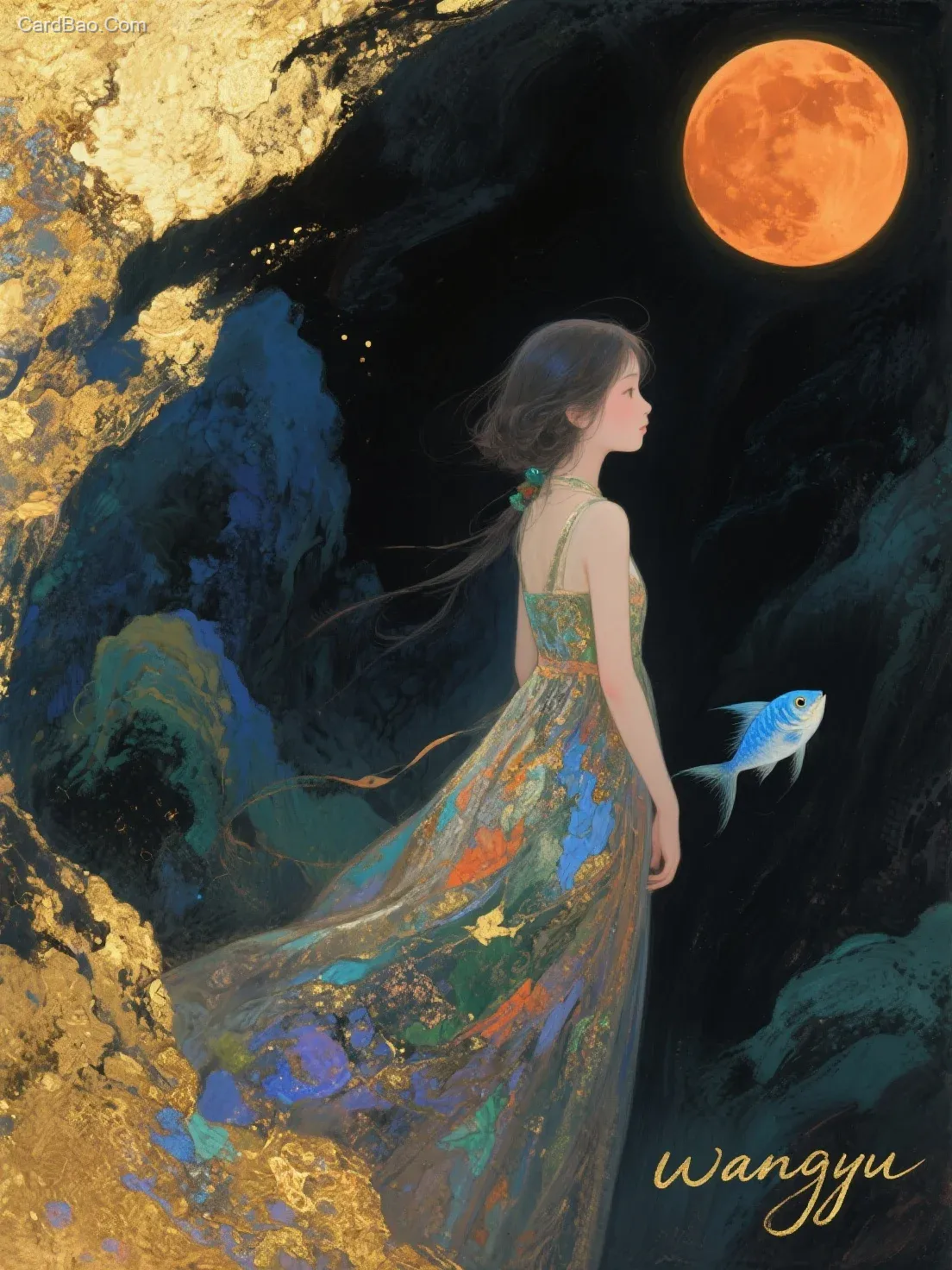 国风油画重彩,女孩,小蓝鱼,唯美深色,特大幻想,橙月,金边效应,意境深远,高清画质。岩彩色彩饱满,色彩晕染,笔触细腻,水墨渲染,右下角签名:wangyu