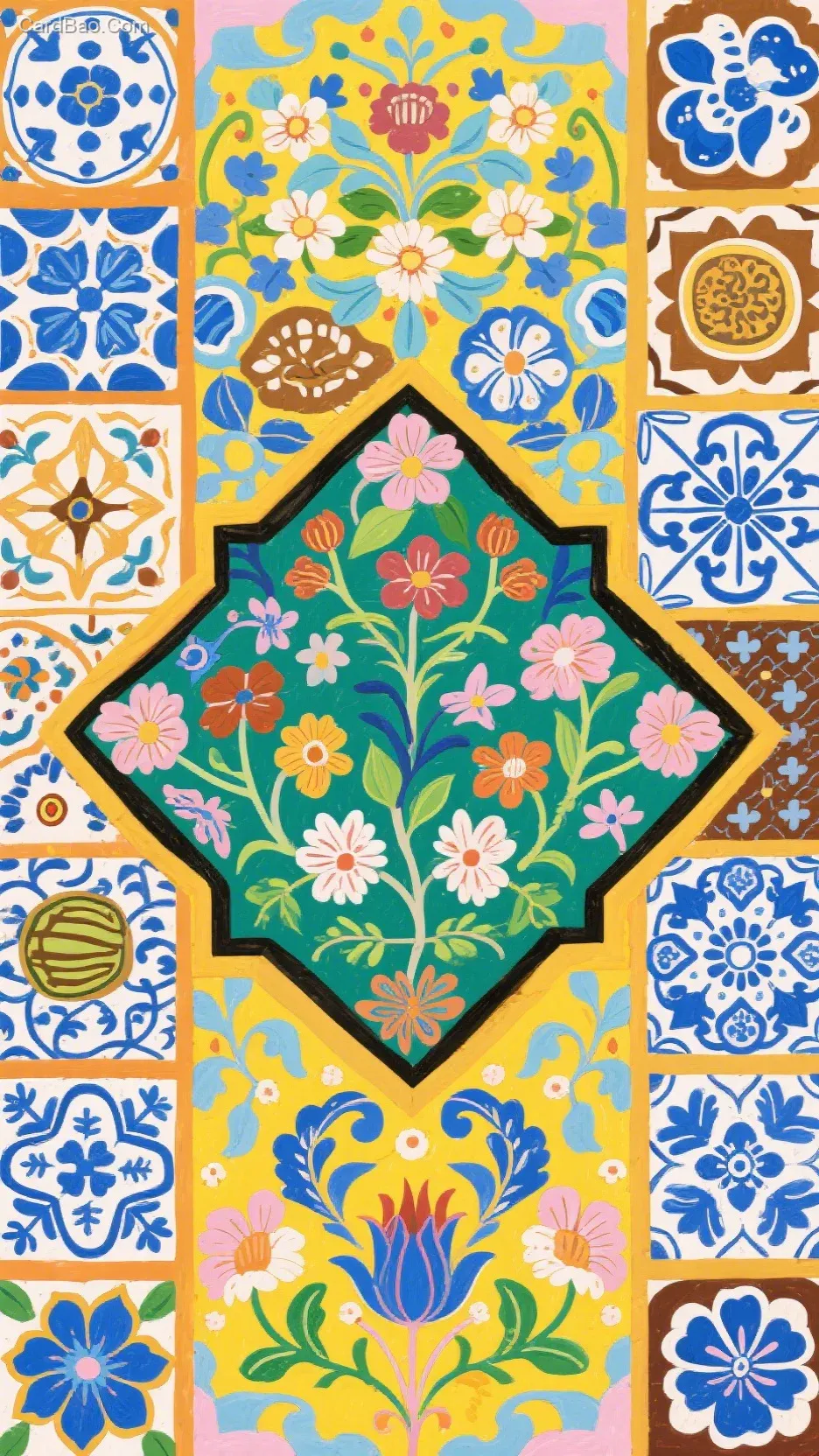平涂装饰画 极繁装饰填满画面,洛可可风格的花草纹 装饰艺术风的几何结构,中式青花图案,精神杂货铺式的多元美学。孟菲斯配色为主调。