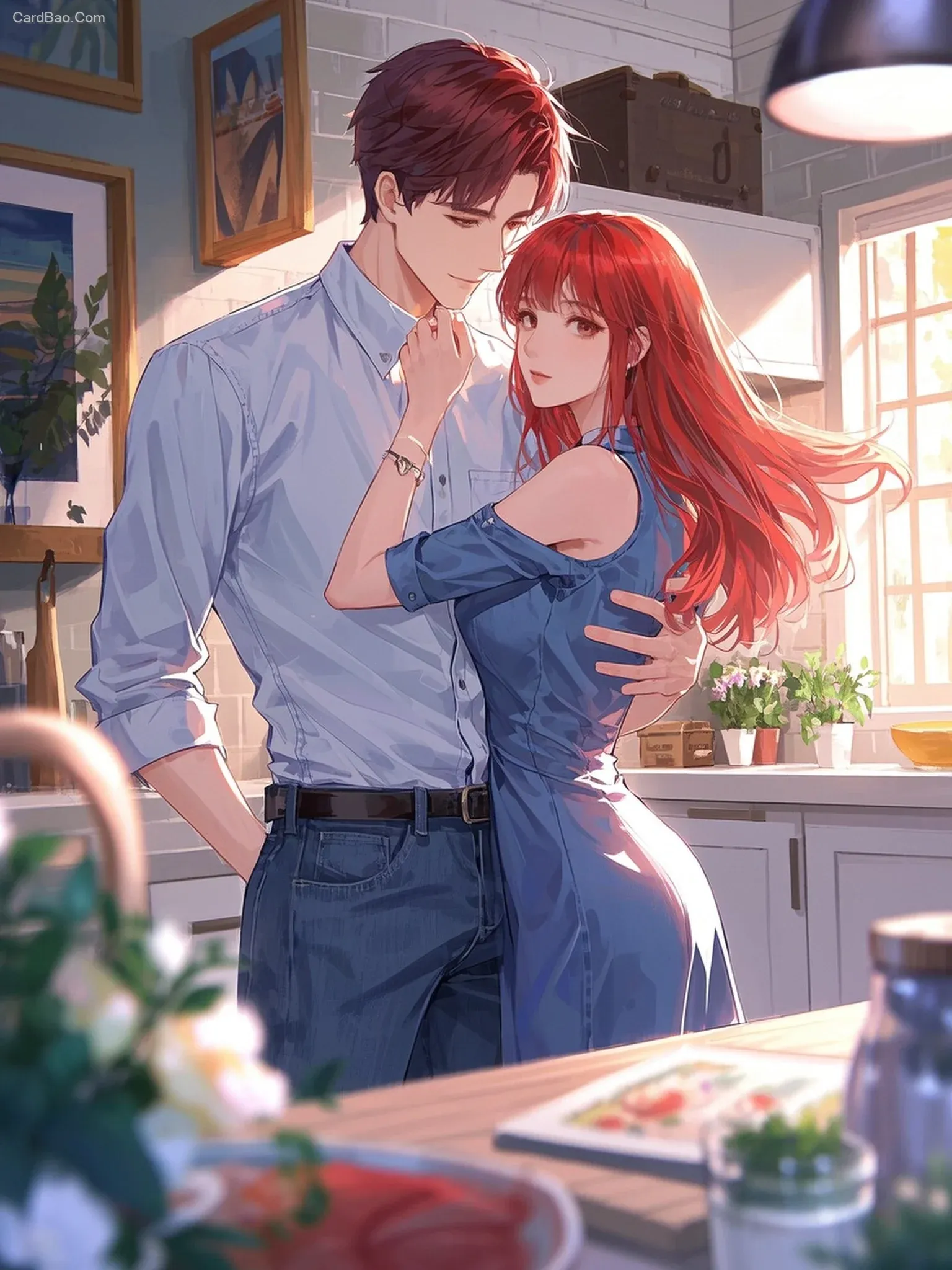 柔焦,一男一女,情侣,东方面孔,五官清晰,立绘,漫画风格,漫画,两个人面向镜头,白色厨房岛台,现代休闲服饰,相互依偎在一起,暧昧半身像,非真人非