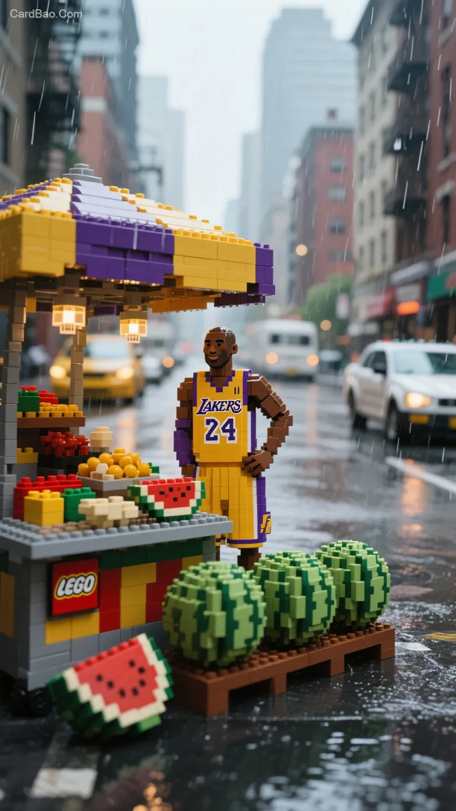 以乐高积木拼接而成,街头摆着大大小小的西瓜摊位,科比元素穿着湖人24号球衣站在摊位后面,雨天城市背景,城市建筑,车辆虚化,创意场景