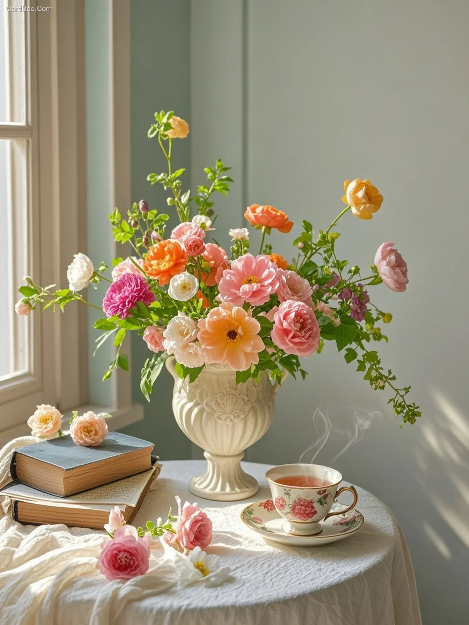 窗户旁 白台布上 古香古色的花瓶 插满鲜花,花瓶旁边一本小说和一杯茶 背景浅绿色场景温熏 阳光柔和明媚,摄影感强烈 高清