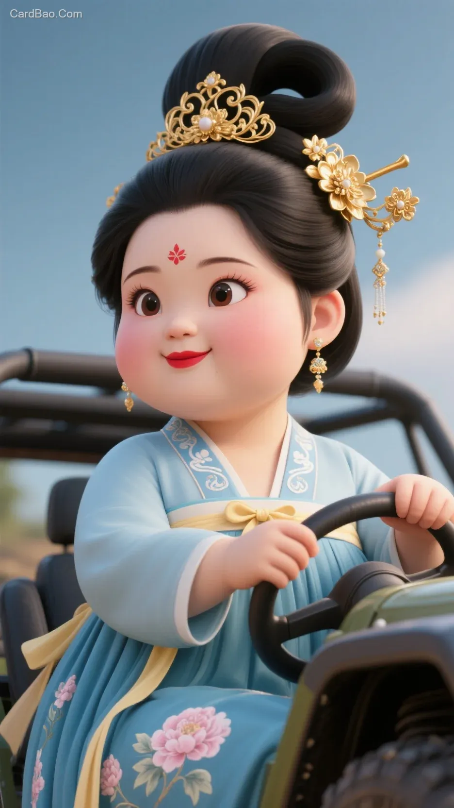 3D渲染风格,超现实主义,一个胖嘟嘟很可爱的古代女子,五官精致,大眼睛双眼皮,眉型为细长的柳叶眉,眉色自然,双眸明亮有神,呈杏仁状,透着温婉灵动之感,鼻梁小巧精致,恰到好处地勾勒出面部立体感,唇形饱满。涂有鲜红的口脂,嘴角微微上扬,似带着一抹浅笑,流露出亲和气质。她的头发乌黑亮丽,梳成了经典的唐代倭堕髻,倭堕髻插鎏金蔓草纹头饰,发髻高耸且富有层次感,线条优美流畅,一侧别着精美的金色发簪,发簪造型繁复,雕琢着精致的花卉或藤蔓纹样,末端垂有小巧的坠饰,随着人物动作微微晃动,另一侧装饰有华丽的金质花钿头饰,增添了几分雍容华贵。她佩戴着一对精致的耳饰,色泽温润,与整体造型相得益彰。身着淡蓝色唐制襦裙,上襦领口绣着细腻的白色云纹,下裙裙摆绣有淡粉色芍药花图案,腰间系着浅黄色丝带,末端打成蝴蝶结。此时开车一辆越野车手转着方向盘,眼神坚定自信。 胖女孩眼睛囧囧有神,特别的有精神,头上发簪的坠饰轻轻摇晃。