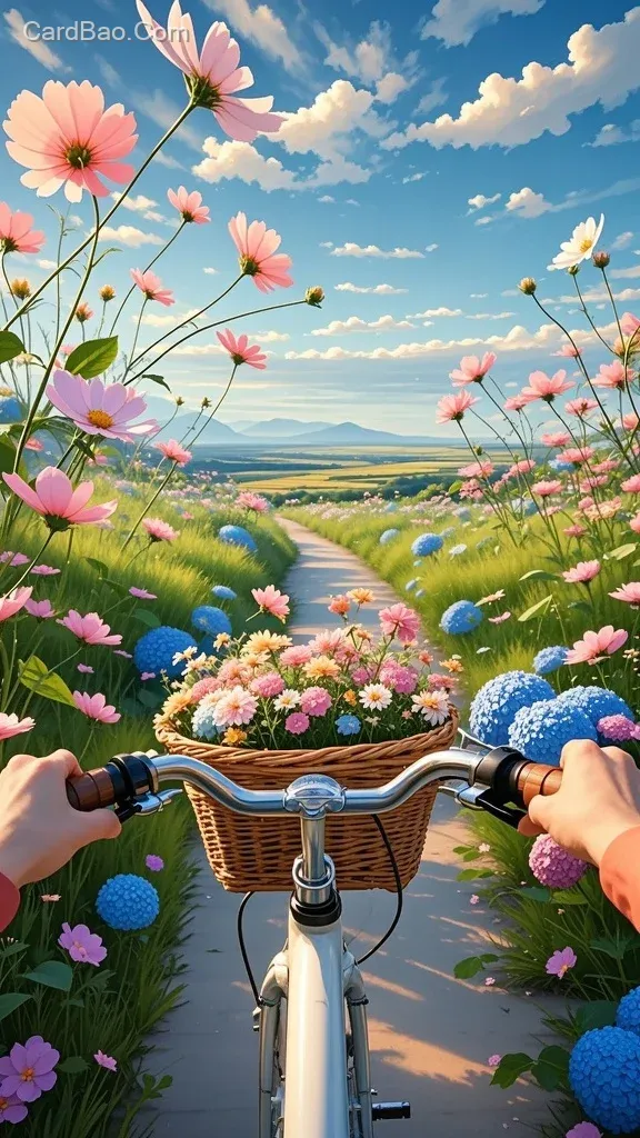 Cinematic realism, first-person perspective, surrealism, dreamlike, fairy-tale world, a winding path extending into the distance, flanked by beautiful cosmos/hydrangeas/irises, small grasses, two hands controlling the bicycle handlebars, a wicker basket overflowing with cosmos/hydrangeas/irises, a plain in the distance, blue sky, cumulus clouds, warm tones, blue tones.