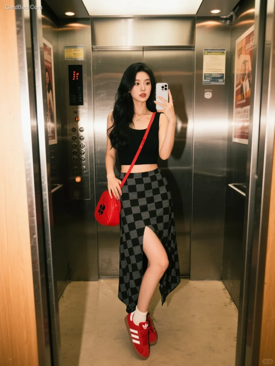 帮我生成图片:时尚都市风格,一位女子,身体修长,凹凸有致,正面平视角度。手持手机自拍,一位温柔有气质的女孩,26岁,黑色长发,御姐脸,穿着黑色坎肩上衣,黑灰纹格长裙,裙子前短后长不规则形状,红色三叶草运动鞋,红色小挎包,背景为电梯内部,有金属壁、按钮面板、广告海报,氛围日常时尚,整体画面采用温馨治愈,高清拍摄