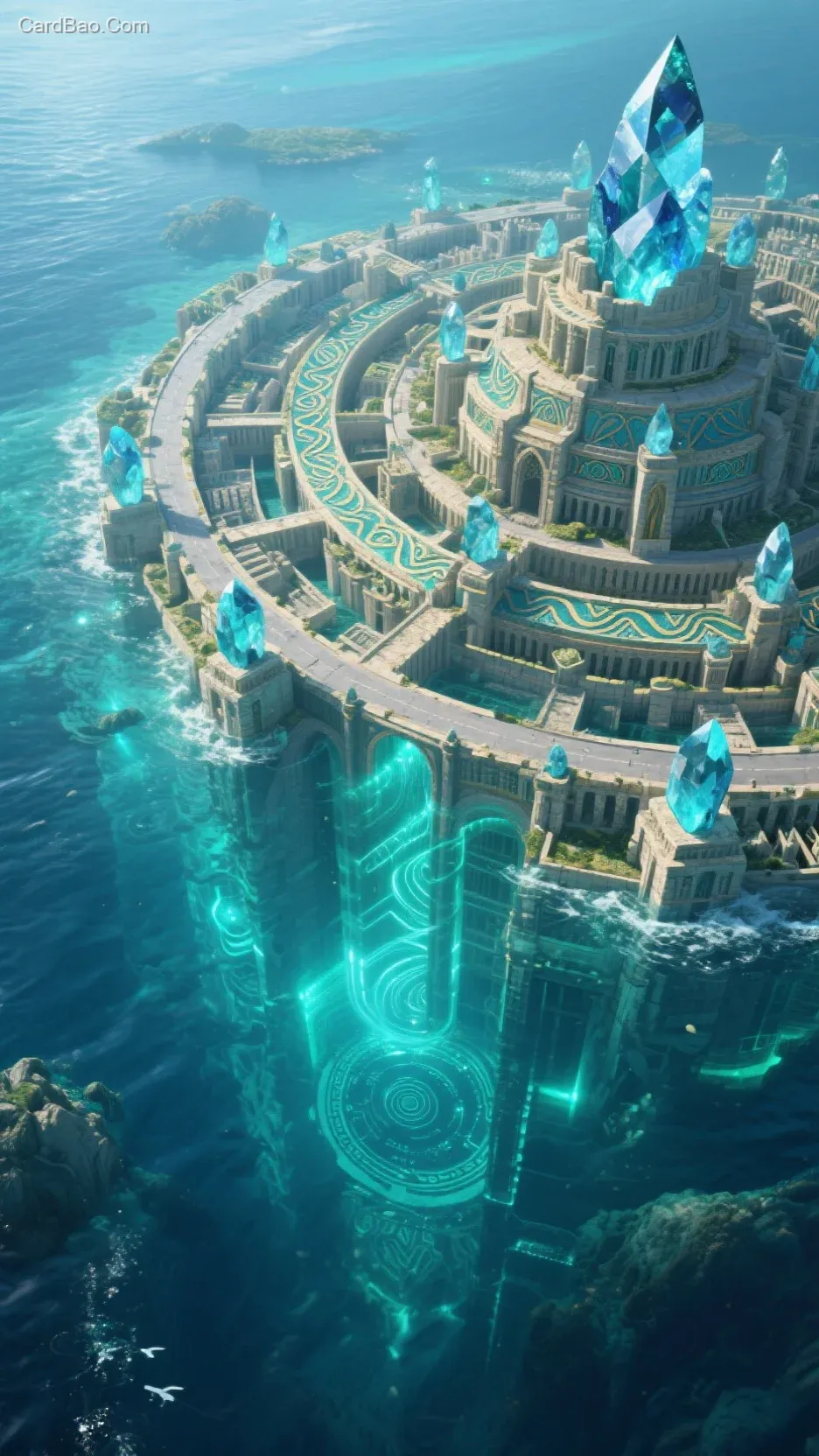 亚特兰蒂斯文明,俯瞰,大海中巨大城市,一半在水面上,一半在水面下,环形街道层层嵌套,史前能量,远古崇拜,水晶文明,光的文明,灵性文明,巨大建筑,波纹装饰,细节能量电路,蓝绿色水晶和石头结构,棱角分明,极其复杂的花纹和光影特效