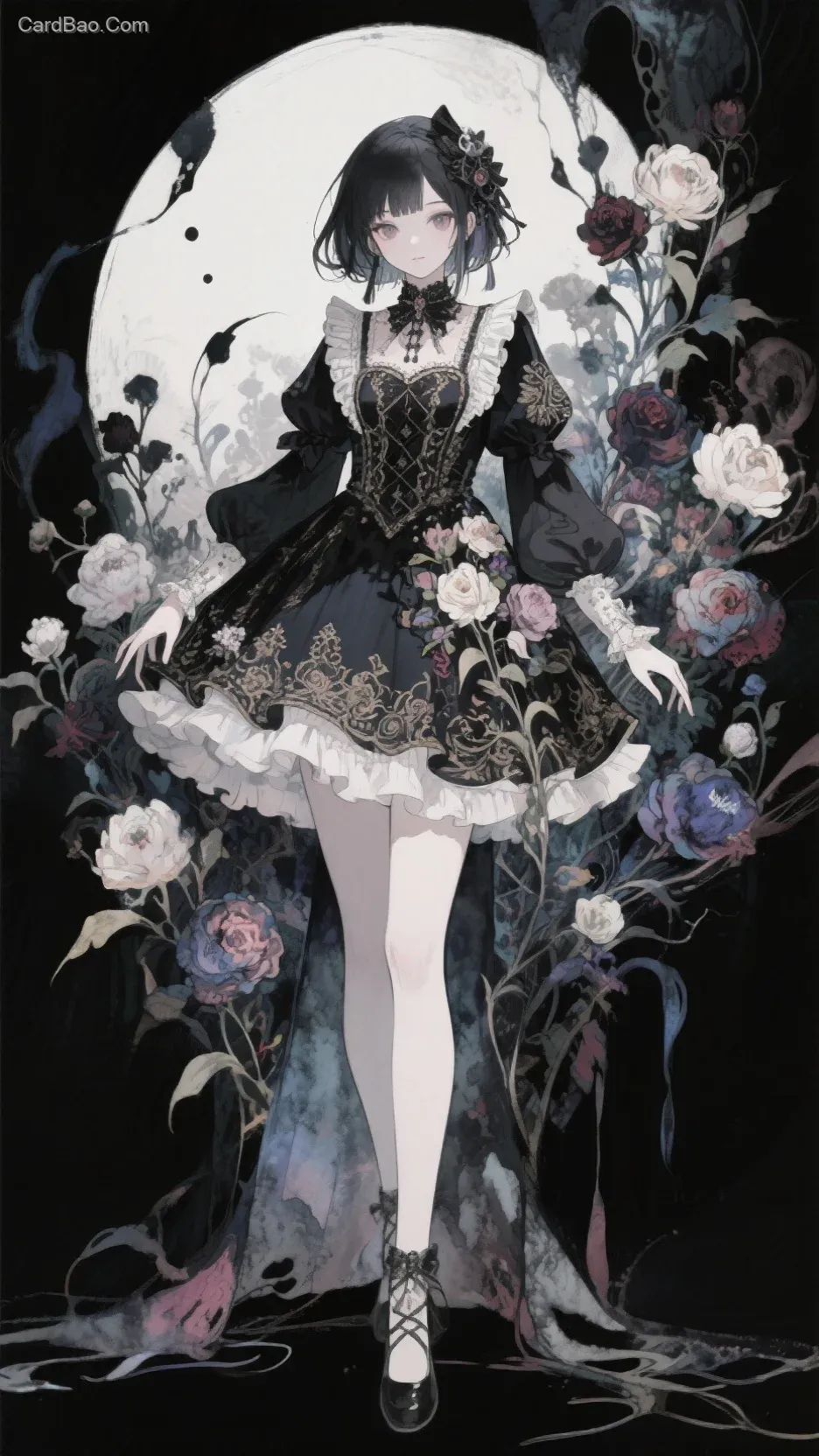 人设图,oc设定,复杂构图,全身立绘,角色立绘,站姿,二次元,动漫,水彩融合水墨,华丽复古风,洛丽塔,花,超细节,超清画质,美女,绝美五官,暗黑系风格,风格独特诡异,怪诞,意识流,超梦幻