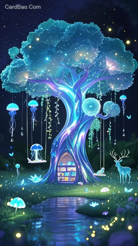 Translucent Emerald Canopy / Fluorescent Blue Butterfly Constellations / Dancing Dewdrop Hammocks / Crystal Vine Swings / Glowing Fawn Antlers Entwined with Stardust / Dandelion Parachutes Drifting / Translucent Jellyfish-Shaped Clouds / Starlit Picture Book Nook in Tree Hollow