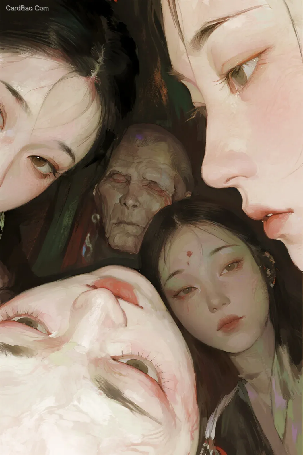 Style: Chinese grotesque. Thick brush strokes with low saturation and clear texture. The image is crafted with delicate brushwork and rich color layers to shape the subject and scene, achieving a realistic texture. The background's lighting and shadow effects create an eerie and poignant atmosphere, blending artistic sensibility with a grand perspective. The lighting is cast from below onto the face, with the camera angle looking upward.
