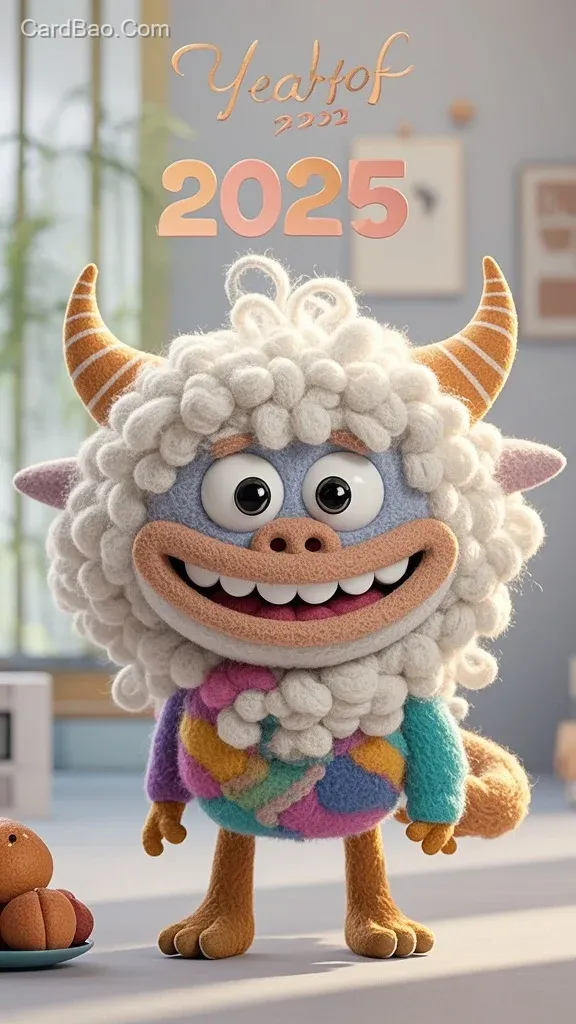 卡通小怪兽IP设计, 3D卡通风格的小怪兽设计,可爱,呆萌,羊毛毡,毛茸茸,古代绝美配色色调,大大的脑袋,头上有两个尖尖的犄角, 嘴巴大大的,眉毛短短,眼睛又大又圆还是白色的,整个形象是拟人化,构图上对称又和谐,用了体积光,背景干净明亮,自然光,高分辨率,细节满满超精致,C4D模型渲染,Octane渲染,3D渲染效果,在Artation、Blender 和 Pinterest 上流行,毛绒玩具,Jellycat 的风格,极小的创意手绘文字 “Year of the Snake 2025” 在画面顶部,文字排版艺术,极简主义,简约高级,杰作,搞笑的,丑萌丑萌的个种搞怪表情更多颜色搭配卷发