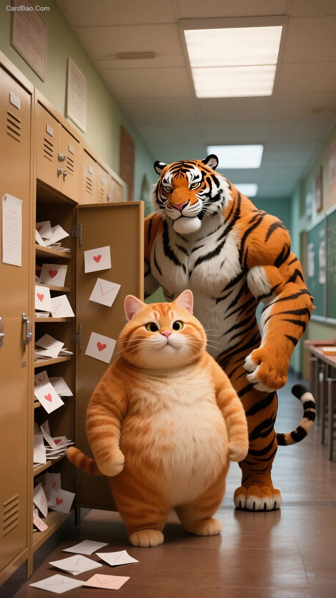 The tiger opens a locker in the school hallway, which is filled with many love letters, while the chubby ginger cat stands beside the tiger.