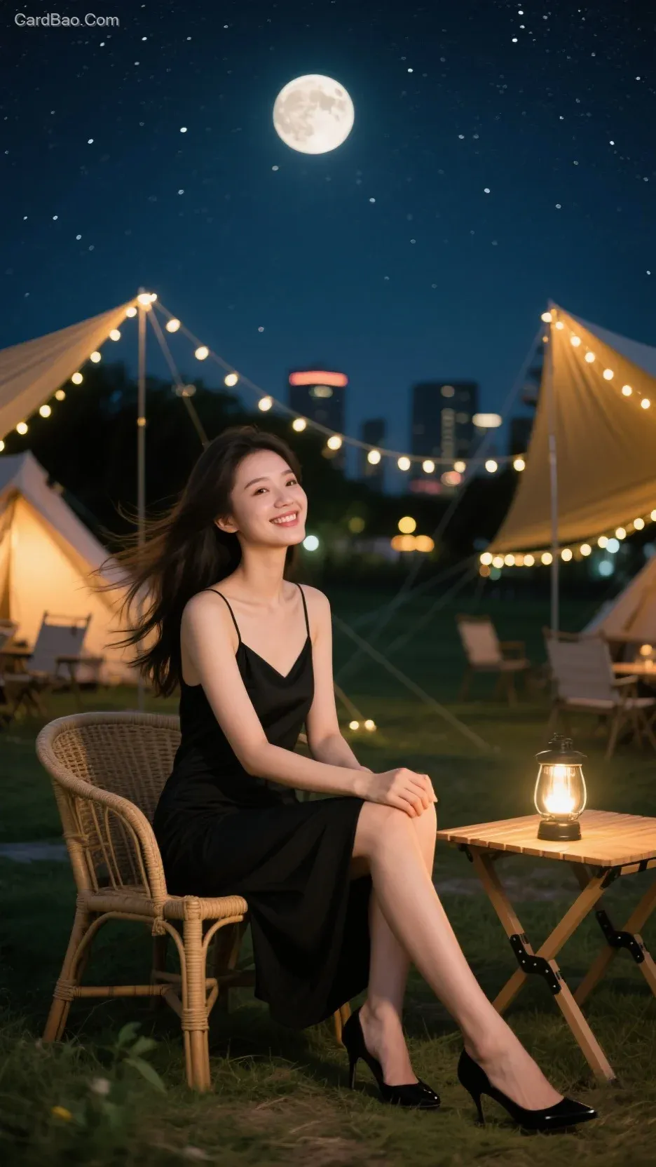 On a summer night at an outdoor campsite, the bright moon hangs high, and stars dot the sky. String lights flicker around the camp. A beautiful woman, wearing a black slip dress and black high heels, sits gracefully on a rattan chair, her long hair flowing in the wind. A small table beside her casts flickering shadows under the lamp. The atmosphere is romantic and leisurely, full of urban elegance. A dynamic video captures her blending into the camping night scene, showcasing the beauty of a fashionable urban woman as she smiles at the camera.