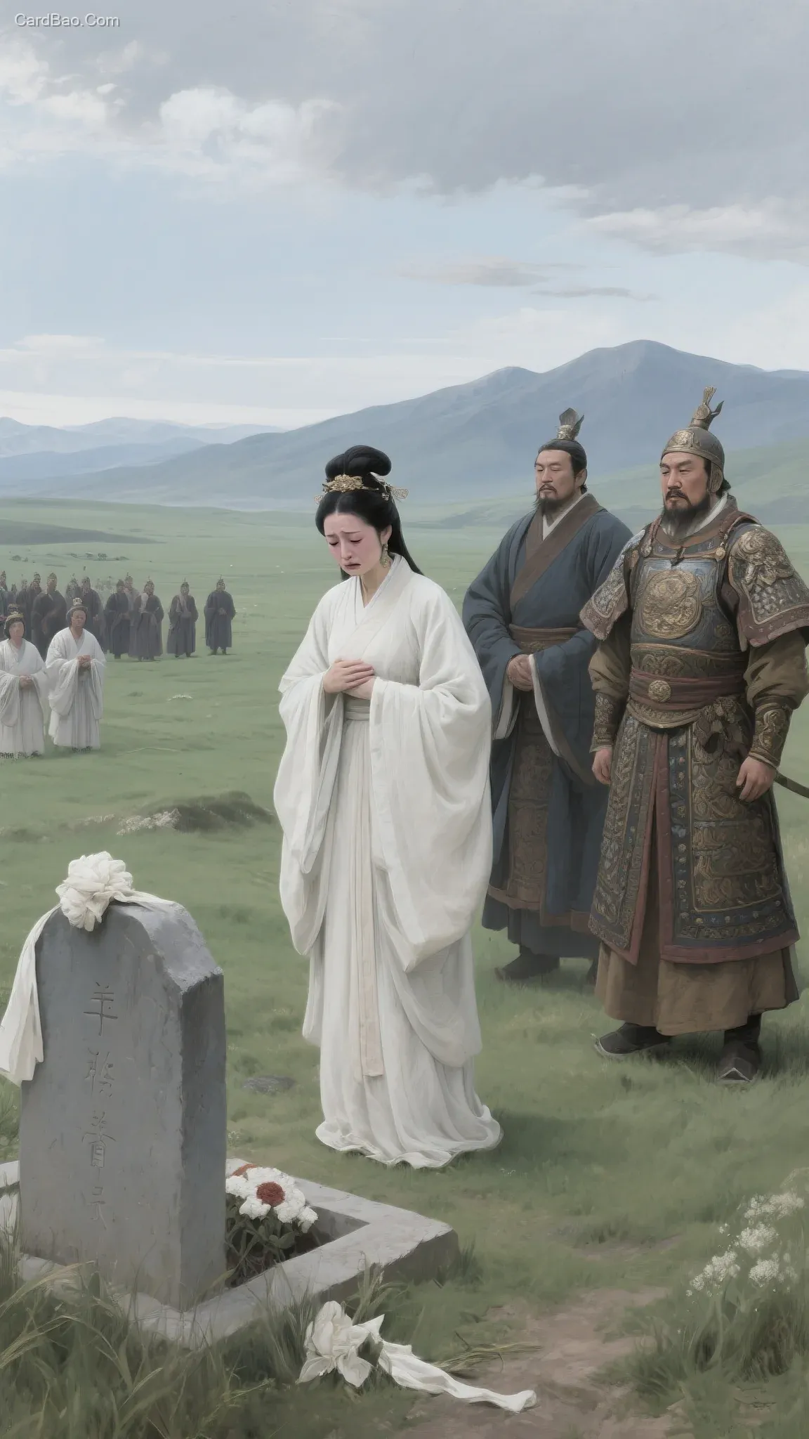 On the grassland, the funeral of Huhanye Chanyu was taking place, with a sorrowful atmosphere. Wang Zhaojun, dressed in plain mourning clothes, stood before the grave, her face filled with grief. Fuzhulei Chanyu stood beside her, his expression solemn.