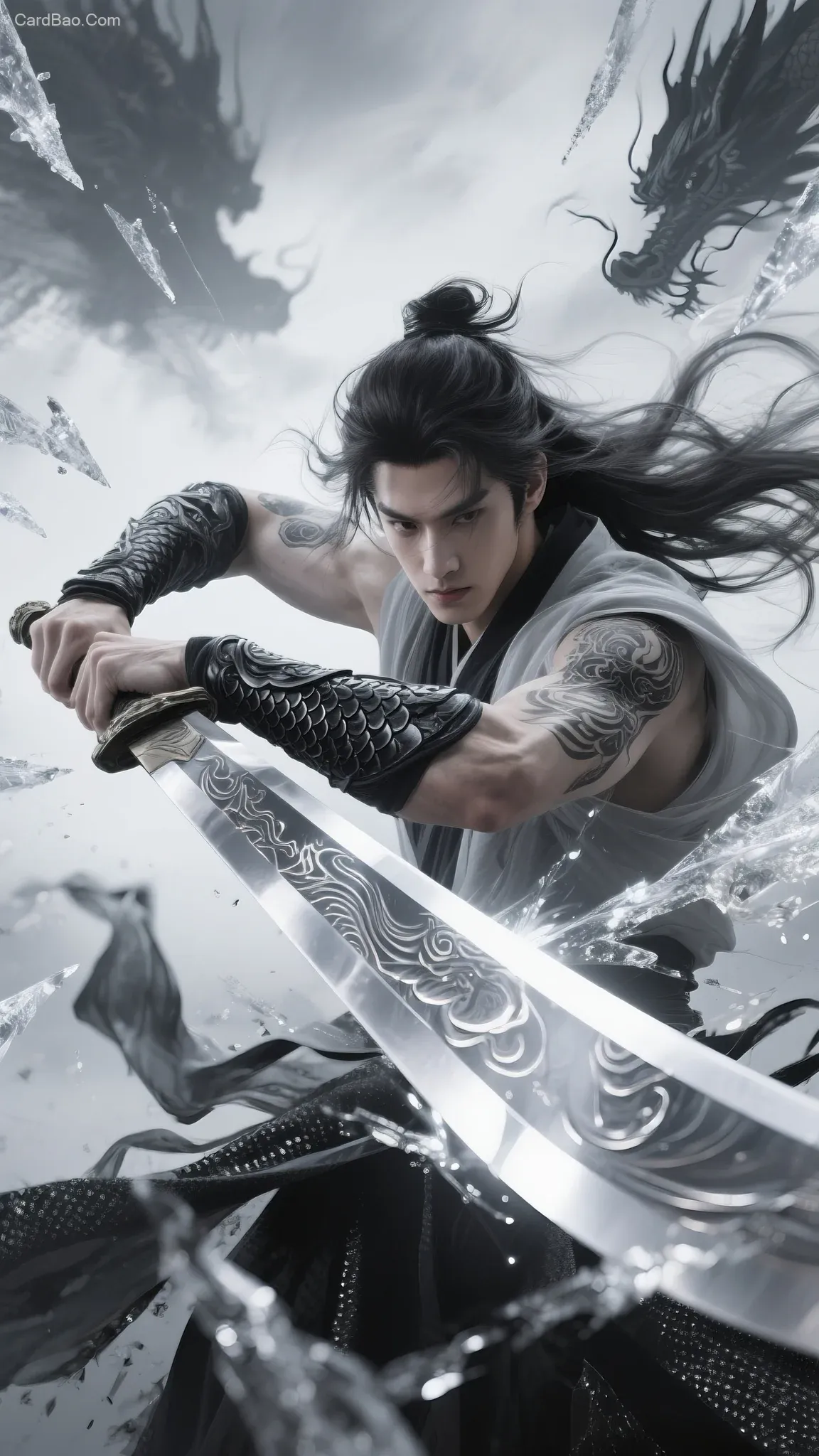 A black-and-white and gray-toned cultivation-themed artwork featuring an exquisitely handsome man with black and gray dragon tattoos coiled around his arm, swinging a blade toward the camera. His pale, wild, and disheveled long hair creates radial motion blur in multiple exposures. The blade drags fluid metallic streaks, while his muscular contours and dragon-scale tattoos morph dynamically into abstract brushstrokes. His cold, sharp facial features are stretched into a hazy glow by the high-speed motion, and the grainy noise along the tattered edges of his robes enhances the rugged texture. An ultra-wide-angle perspective exaggerates the distortion of the blade's tip. Between his floating strands of hair, icy energy particles crystallize, while the background blends with ink-wash strokes of a chaotic sky, interlaced with residual blade-light trails. A shallow depth of field diffuses the dragon-scale patterns into scattered bokeh effects, and the metal blade surface reflects distorted spatial ripples.