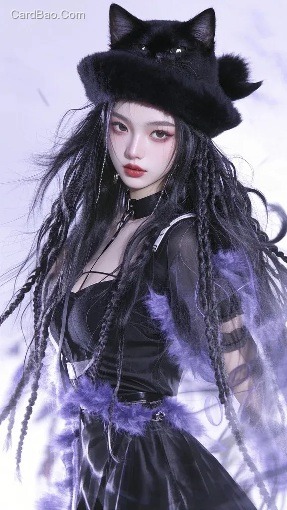 长卷发,猫耳针织帽子,小黑猫趴在帽子上,年轻慵懒魔女,神秘,强大,动态,野兽派,华丽的卷发,发尾梳着许多小辫子,透视感,细节丰富,波普艺术,全身,潮服,时尚,街头背景,