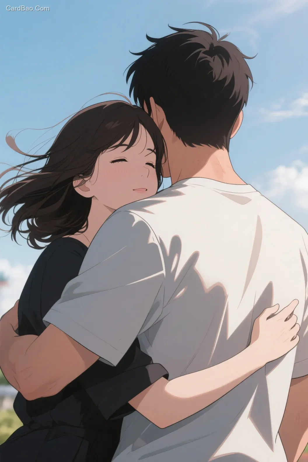 A man's arm wraps around a woman's shoulders from behind, the woman rests her head on the man's shoulder, her hair blowing in the wind, captured in a fixed-frame shot in anime style.