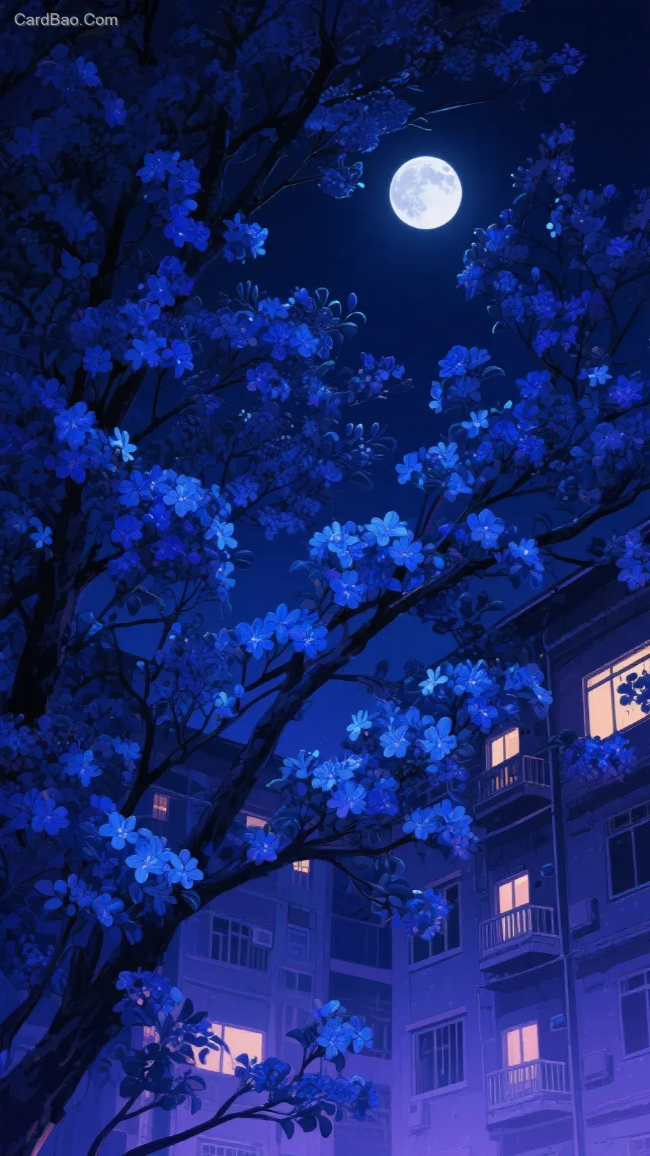 oc渲染,插画,暗夜微光,细节刻画,蓝盈花枝叶繁茂,蓝盈花枝层层叠叠,透过树枝可以看到月亮,还有居民楼房,楼房有灯光,蓝盈花泛光,纹理,肌理,光影变化明显