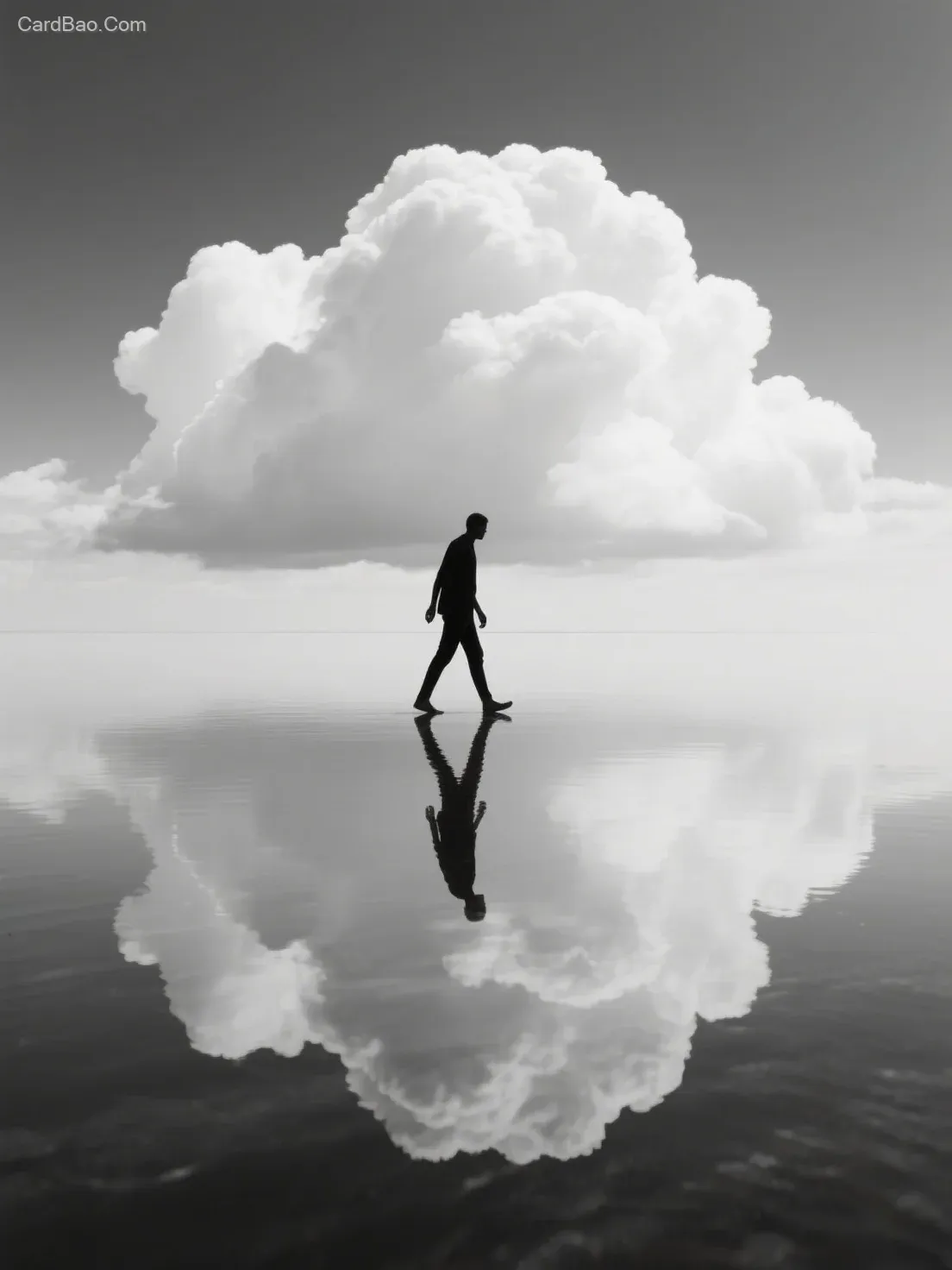Minimalist black and white photography, a person walking on a mirror-like water surface in a vast landscape, with huge fluffy clouds hanging low, creating a lonely and tranquil atmosphere, emphasizing simple composition and strong contrast.