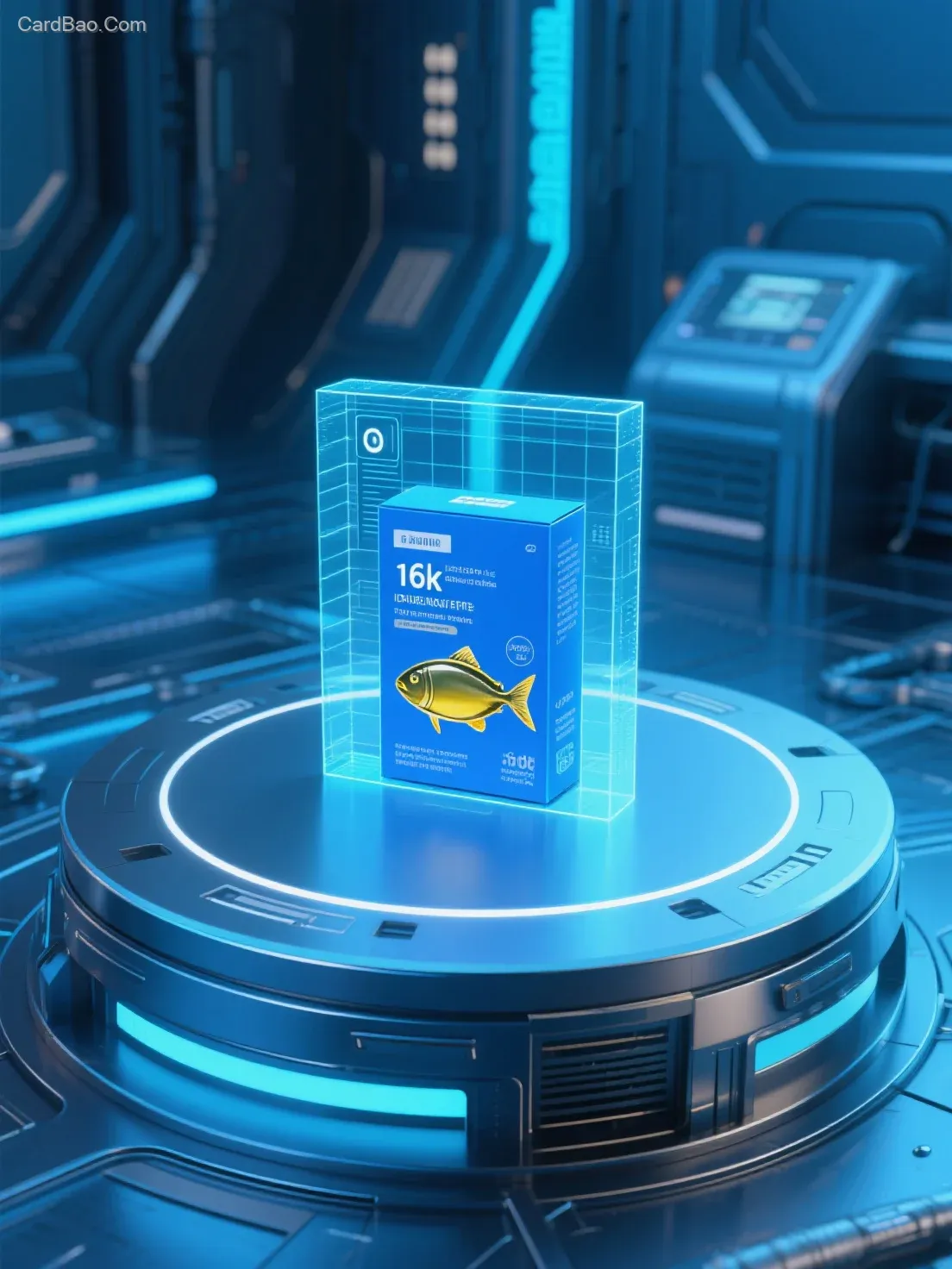 Future technology laboratory scene, a box of blue packaged fish oil placed on a circular test bench, holographic projection, blue-toned metallic texture, 16K ultra-high-definition rendering