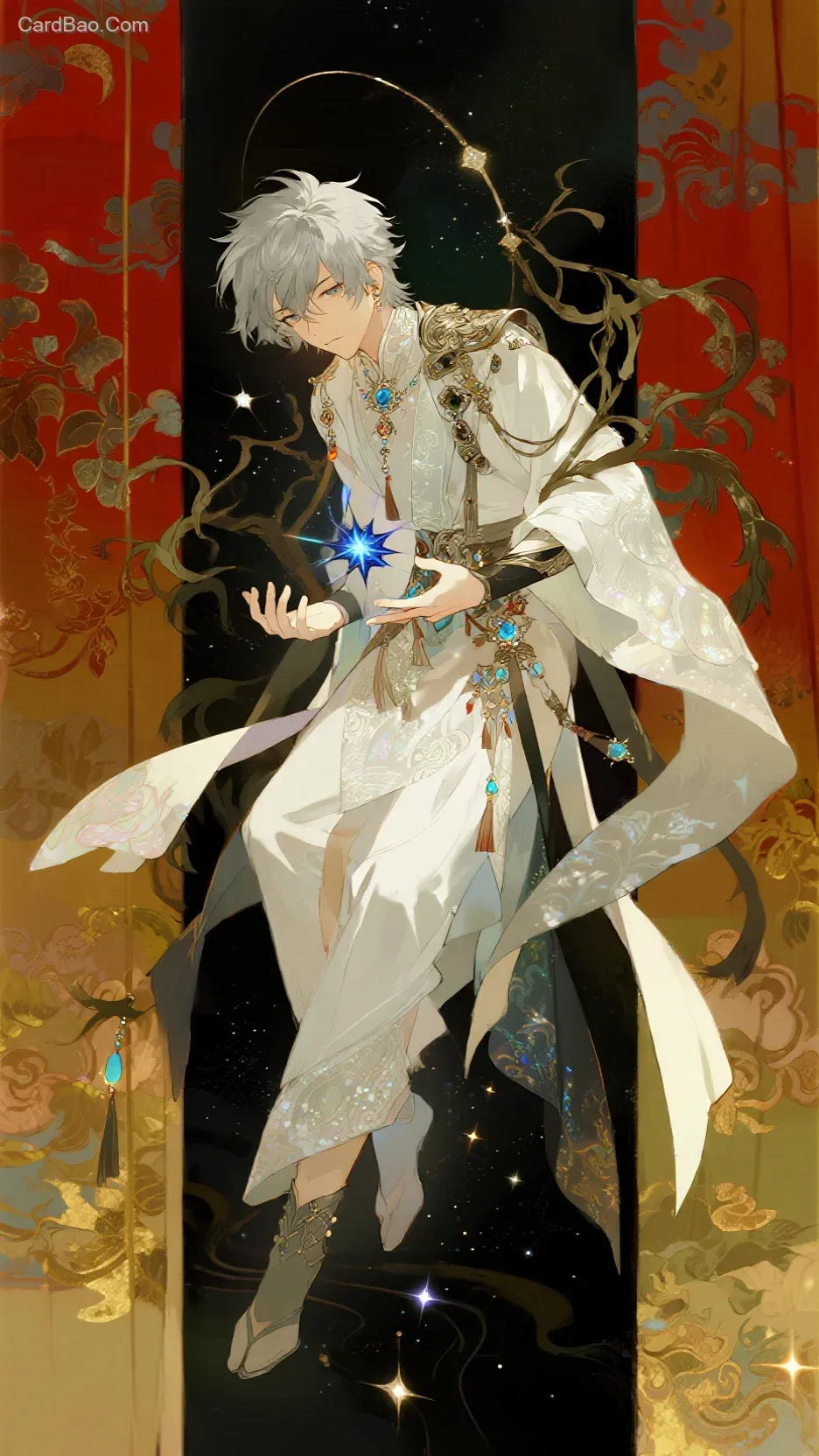 The main subject is a young man with voluminous, silvery-gray hair resembling starlight, glossy like satin, about to stumble. His divine armor is composed of stars, appearing as a single color for now. The youth is dressed in traditional attire made from sequined gauze, sequined velvet, organza, lace, tassels, embroidery, prints, and soft satin, with intricate draped folds and lavish accessories, including subtle patterns. A masterpiece rich in artistic conception.