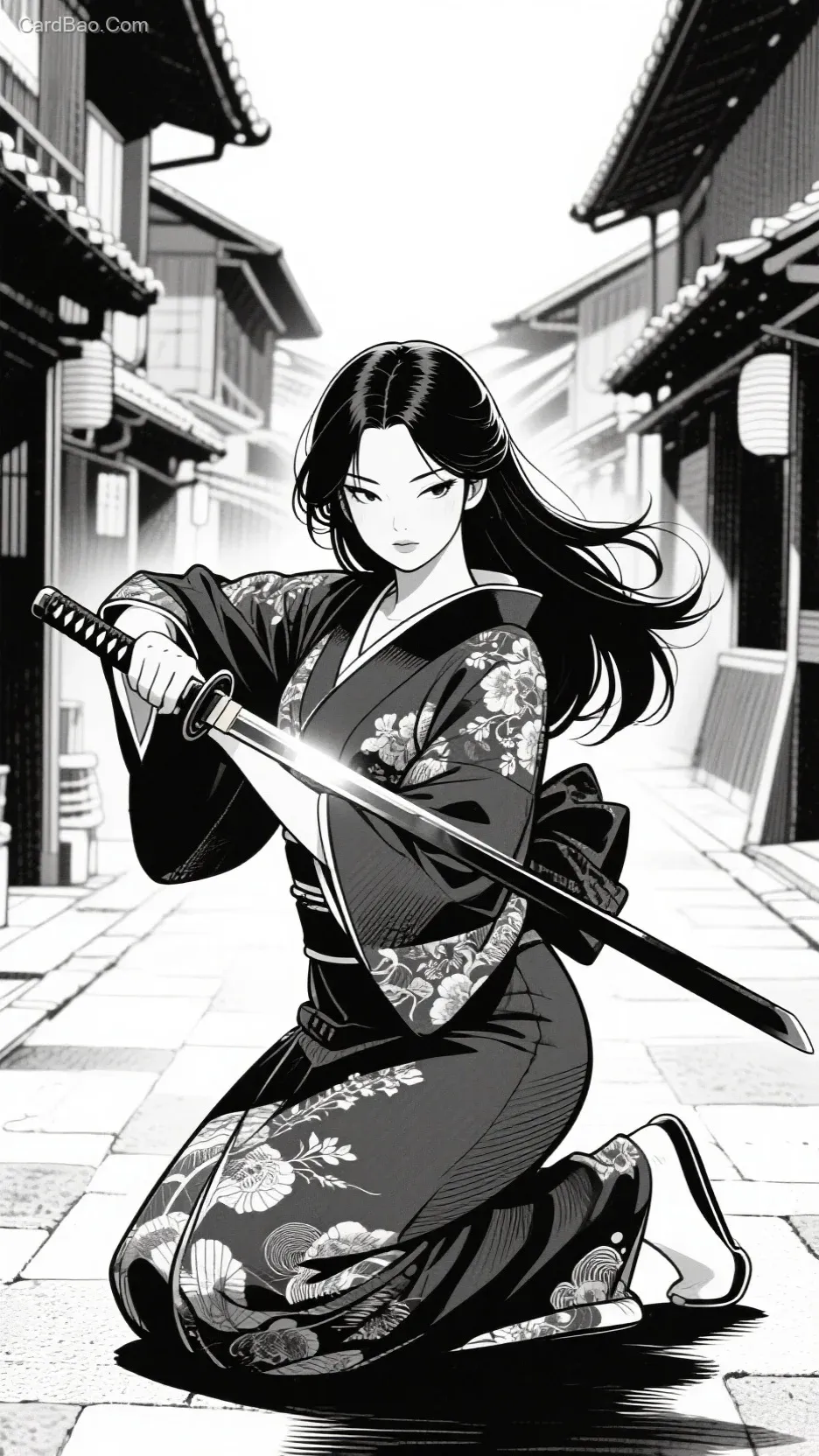 黑白平面2D,半写实黑白漫画风格,精致线条,大师级排线绘制技巧,强烈阴影对比,全身像。随机风格女性,非常规构图。妩媚。抱日本武士刀的华丽和服女性,披散的长发,微曲膝盖拔刀的姿势,远景,干净线条绘制的背景,眯眯眼,京都幕府街道,