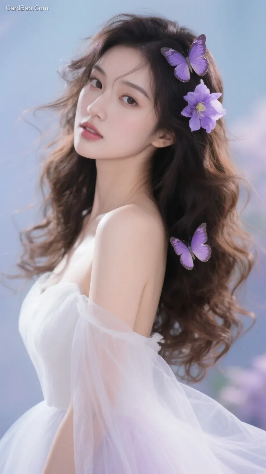 A sexy beauty with long, slightly curly hair adorned with pale purple flowers and butterflies, wearing a white chiffon dress, set against a soft, dreamy background. 8K ultra-high definition, enhanced image quality, exquisite composition, breathtakingly dreamy, with strands of hair gently brushing her face in a light breeze. Studio photography.