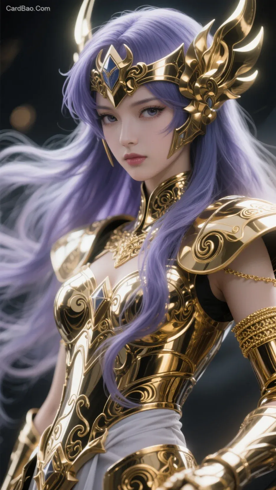 液态金属装甲,冥斗士雅典娜,城户纱织,蓝紫色长发,女神的圣斗士,战锤40k风格的阿斯塔特浅金色神圣衣,极其复杂的花纹和光影特效,飘逸的头发,极其复杂的盔甲,流动的反光,电影滤镜 ,16k高清,虚化引擎光影特效,金色超细臂钏,黄金比例的绝美五官,绝世美人,立体的五官