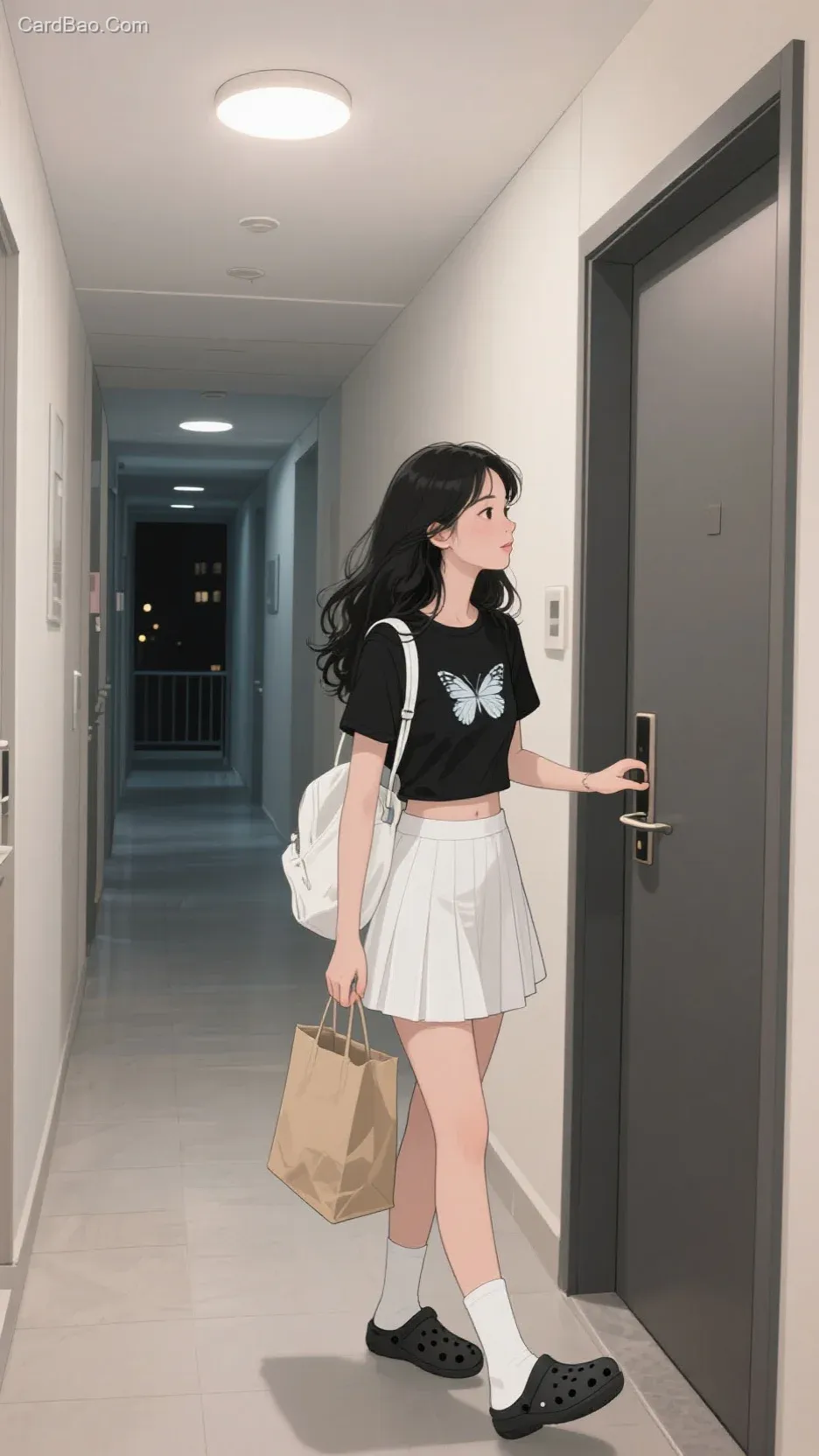 At night, a 25-year-old modern urban fashion-forward woman (named Xiaoxue) has a standard oblong face, long black curly hair, and delicate, beautiful side and front profiles. Her skin is snow-white, with a straight nose, pouty lips, and double eyelids. She exudes confidence, maturity, stability, and elegance. Her clothing style is sweet and edgy, wearing a black short-sleeved T-shirt with a butterfly pattern, a white pleated skirt, white ankle socks paired with black clogs, and carrying a white bag. In her other hand, she holds a khaki shopping bag while gripping a door handle with one hand. The scene is set in an apartment hallway, with a round ceiling light on the ceiling. The composition uses a straight-on perspective, with the character positioned slightly to the right and lower part of the frame to emphasize the subject, while the hallway extends into the distance.