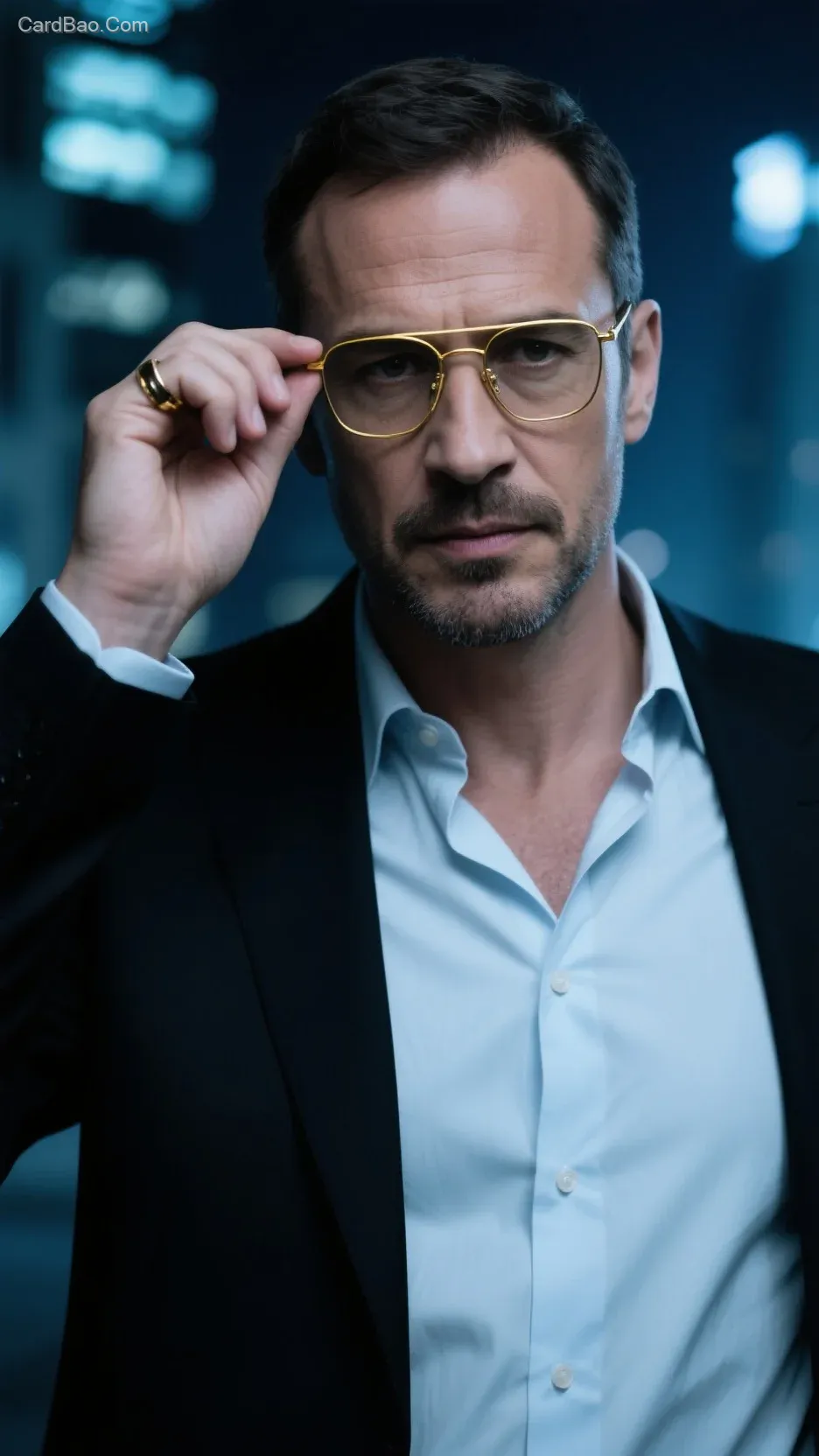一位身穿黑色色西装的30岁外国中年硬汉,单手推起金边眼镜,镜头聚焦在他手与眼镜之间的动作张力,左手带戒指,衬衫扣子和领口整洁,背景模糊的城市夜景
