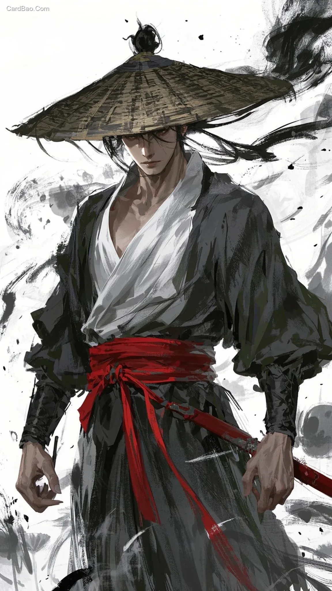 高级CG,游戏原画,细腻,半厚涂低饱和,真实肌理,一个中国古代剑客,武侠风,红色腰带,戴着斗笠,低头,盖住眼睛,武侠风格,白色背景,细致,精品,杰作,水墨画,墨烟,墨云,泼墨,色带,墨水,墨黑白莲花,光影艺术,中式古典风格,超现实主义插画风格,高清,画面精致超现实人像绘画,动态优美,特写,高级的阴影,俯视角,超现实主义,压抑,压迫感,插画,CG感,低饱和,高级感,氛围感,杰作,极简风,高级,朦胧美,低曝光,磨砂肌理绘画,笔触感,肌理感,立体的五官及外型,发丝飘动细节,精致真人皮肤质感,厚涂油画笔触技法,中心构图,HDR色彩分层。写真皮肤。立体五官,细致细节,纹理感,35mm焦段,高清晰画质,真人摄影质感,电影级画面,特写镜头,中景。真人写真画面,立体,厚涂。正面朝向镜头,张扬,亵渎艺术,辛烷值渲染,超写实,虚实结合,主次分明,分镜动漫