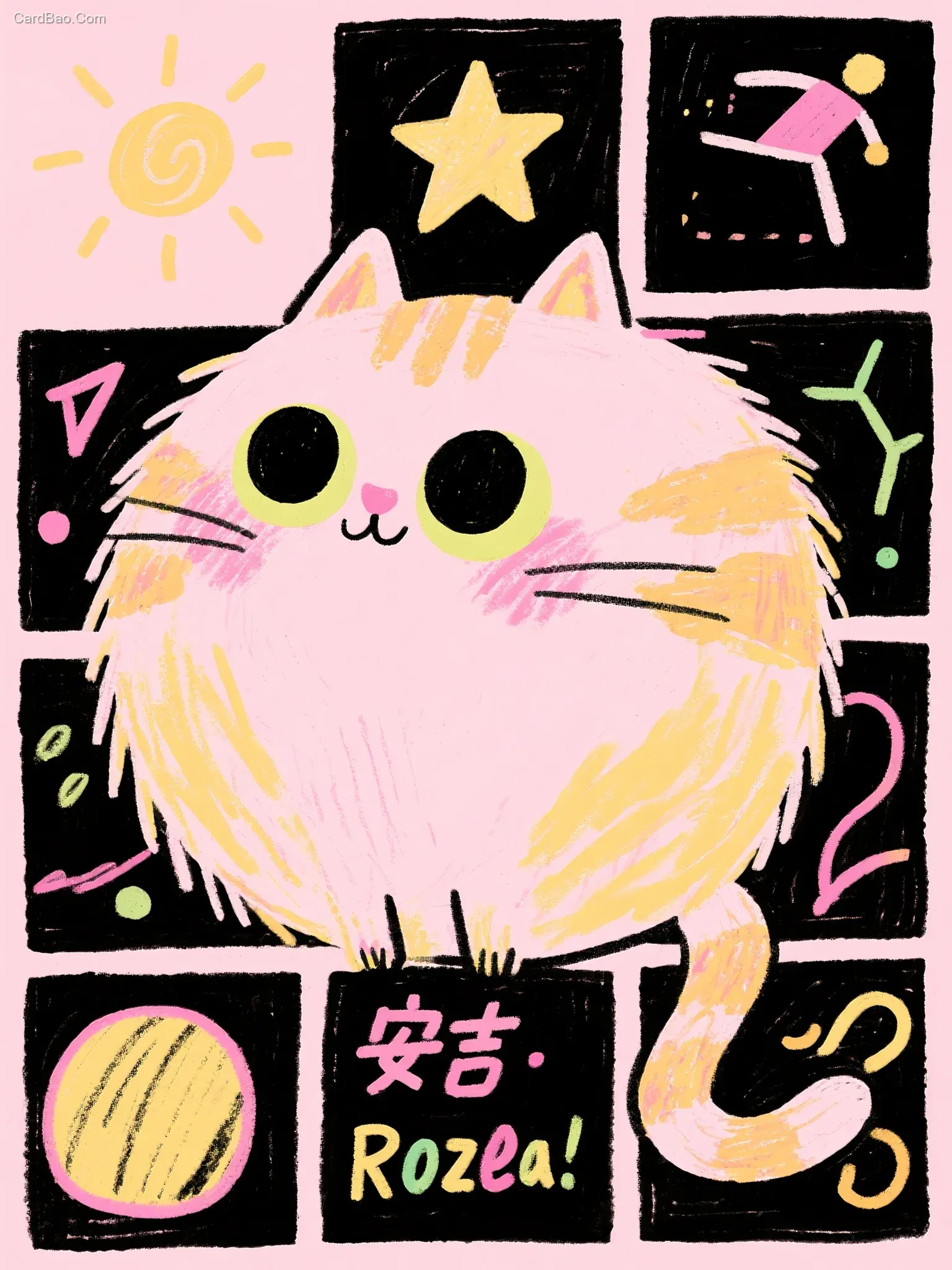 Draw an illustration of an adorable cat in the style of crayon drawing, inspired by the illustrator Angie Rozela. Incorporate elements of structuralism, with textured paint application, hand-drawn details, and exaggerated forms. The background can include abstract patterns such as the sun, stars, or sports symbols to complement the theme. Add unique text to the image to create a lively and fun visual effect. Arrange the composition in a nine-square grid layout.