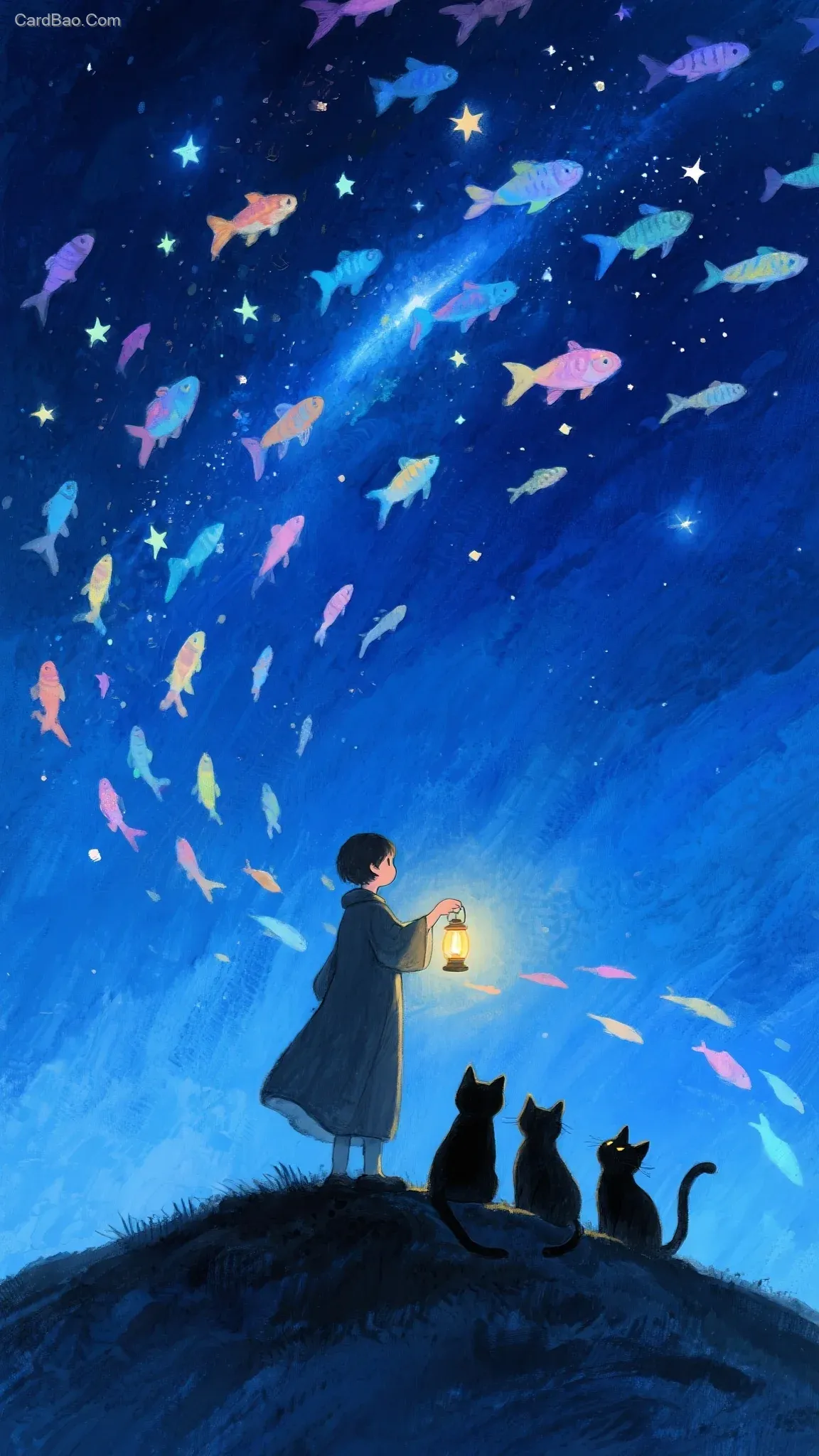 水墨插画,意识流,宇宙星空,一个穿着长袍的小人提着一盏灯,站在一个小山坡上,旁边还坐着三只小黑猫,背景是一大片星空,很多星星颜色的鱼在天空中游动,幻想风格,充满了幻想和魔幻的元素,空中的鱼和星光,深蓝色的夜空,点缀闪烁的星星,宁静而神秘的氛围,浪漫而神秘,精细的描绘,梦幻,绚丽的水彩绘画,仰视视角,氛围感,手绘风格,深蓝色调,16k,高质量,杰作,朦胧,模糊,涂鸦,精准构图