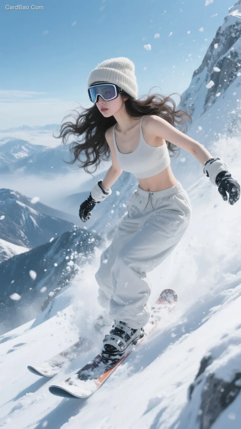 东方绝世佳人,长发大波浪,身材纤细,身穿挂脖短上衣,宽松的滑雪长裤,雪镜,绒线帽,在积雪覆盖的陡峭高山斜坡敏捷滑行,冬季晴朗白天,雪花飞溅动态模糊效果,真实风格,冷色调光影与雪雾粒子,远景俯拍展现山脉轮廓,滑雪板在雪面划出流畅弧线,高清渲染,脸部清晰,细腻画质,明暗对比,艳丽的油画质感,细腻肌理,超级精细CG,超高清,最高画质,写实逼真,微距镜头,面部阴影,面部聚焦,丰富细节,朦胧感,高级感,垂坠感,冰雪氛围,光影美学,发型光,发丝光,伦勃朗光,精美繁复华丽风格,CG厚涂,32K高清画质,32K细腻真人皮肤纹理。Houdini强大的动力学模拟sharp focus渲染