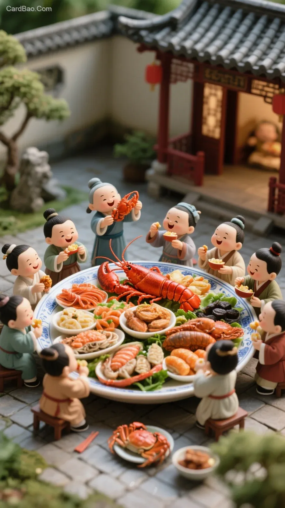 微缩景观,一个巨大的盘子上摆满了丰盛的海鲜,十几个穿着汉服的可爱小人们围坐在盘子周围,有的小人用手拿着大龙虾品尝,有的小人伸手拿螃蟹津津有味的吃着,还有的小人在交谈。背景是古风中式庭院,要求:小人描述都有说有笑,动作要具体,分工明确。