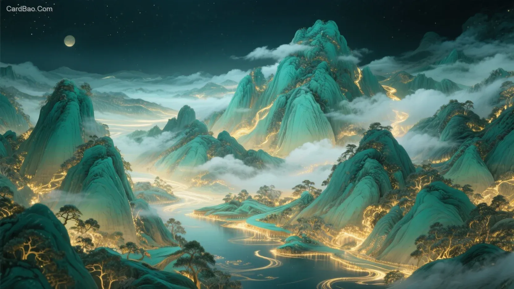 An 8K ultra-high-resolution artistic masterpiece, showcasing extreme detail and extraordinary precision. The scene draws inspiration from the night version of "A Thousand Li of Rivers and Mountains," delicately depicting the vividness and dynamism of China's famous mountains and rivers. Three-dimensional lighting effects create a mysterious atmosphere, subtly accented with elegant, transparent golden light. The mountains are rendered in a gradient of cyan and green. The entire painting is meticulously crafted with realistic details and masterful brushwork, presenting a visual feast. The mountains are shrouded in swirling clouds, shimmering with flowing light and an ethereal, celestial aura.