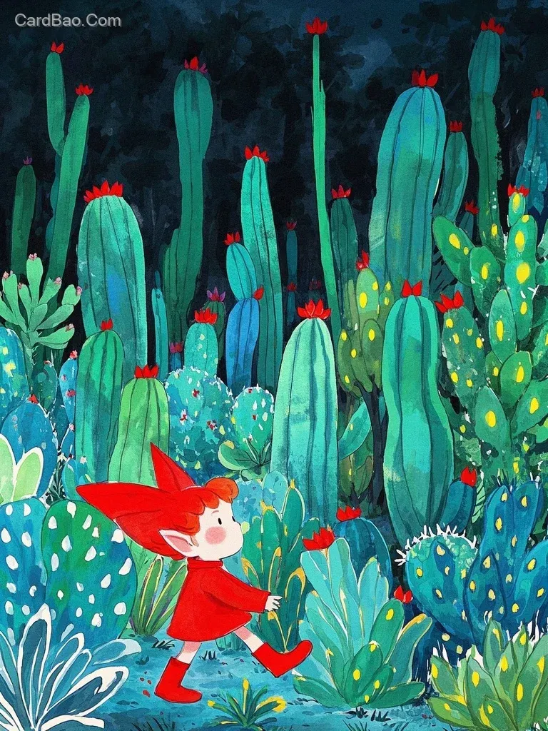 水彩插画,奇特茂密的多肉森林,茂密高大,幽暗神秘,一个红色衣服的小精灵,侧脸,高饱和度颜色,鲜明笔触,写意线条,治愈感,几米绘本,大师构图,超清
