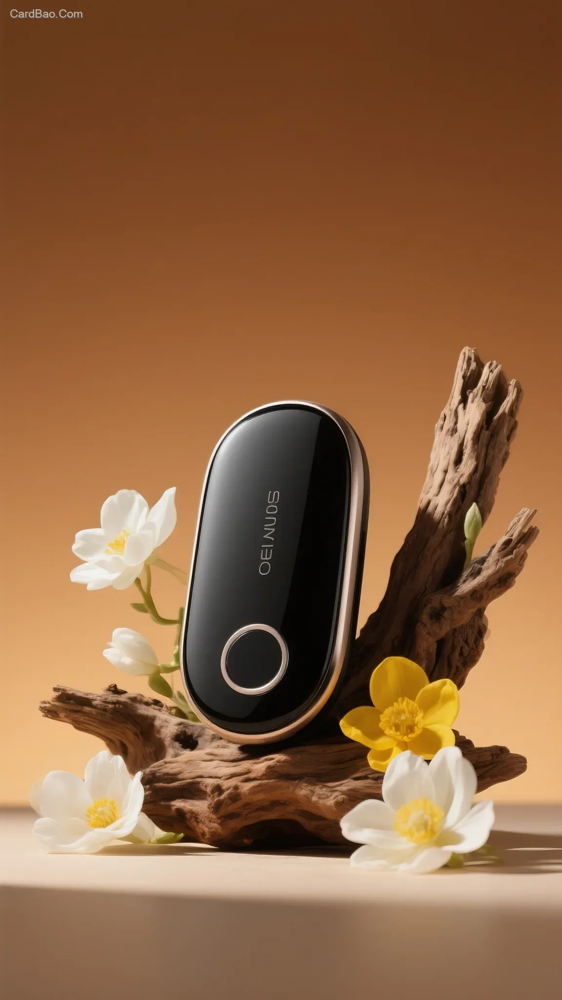 图中是 一款偏方椭圆形黑色的脱毛仪 。背景是暖色调的,有枯木、白色和黄色花朵等自然元素,营造出自然、优雅的氛围。风格简约符合设计美学