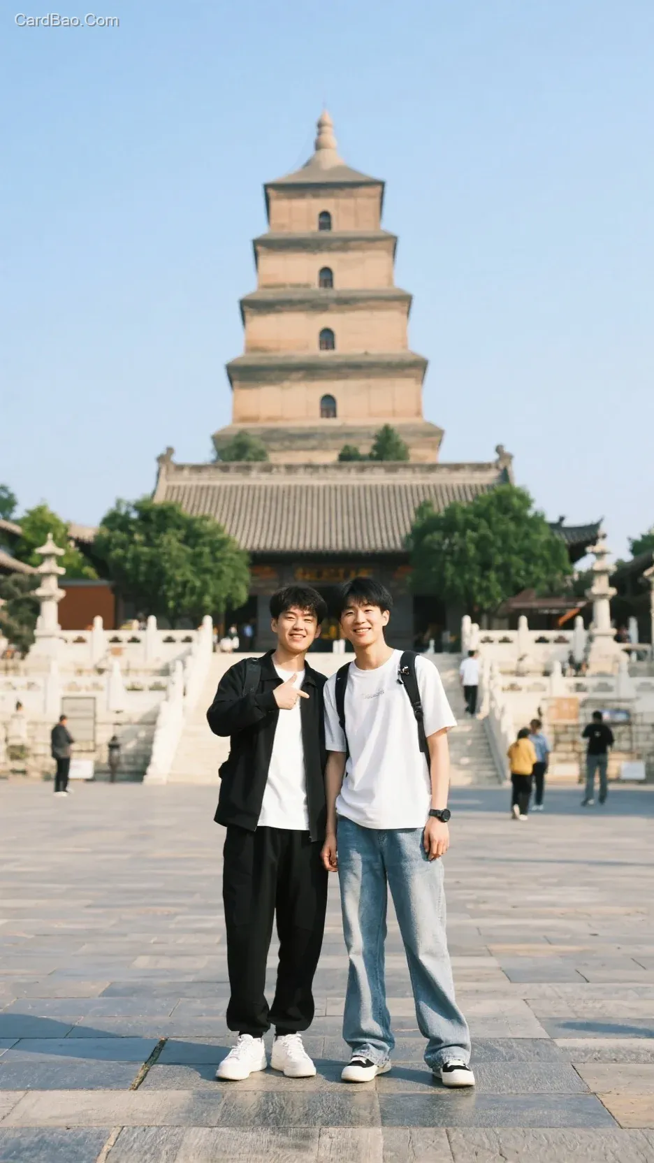 Two young people taking photos in front of the Big Wild Goose Pagoda as a memento.